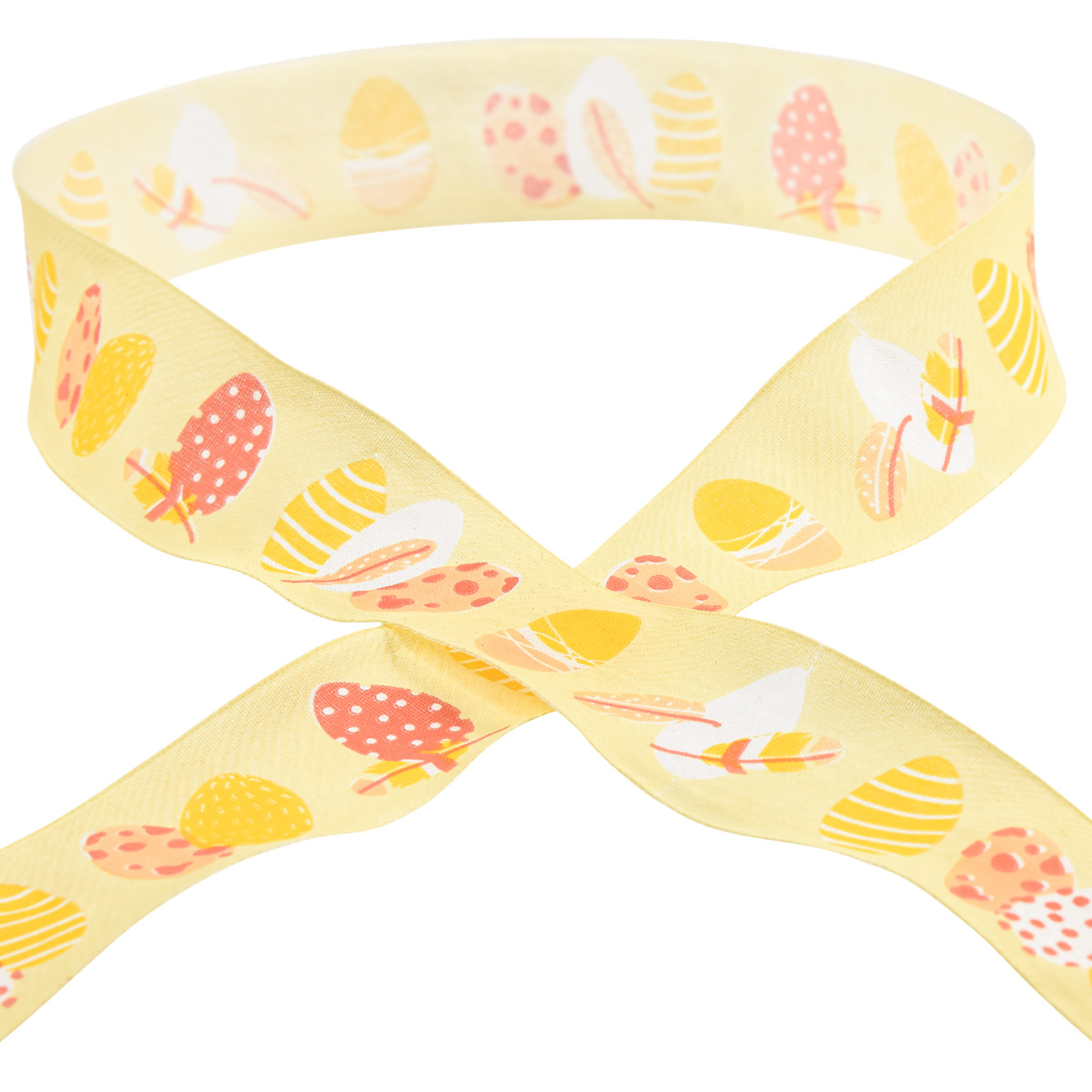 Auf dem Band sind auf hellgelbem Grund in drei Farben gestreifte und gepunktete Ostereier abgebildet. Dank der Webkanten franst das gelbe Osterband nicht aus.