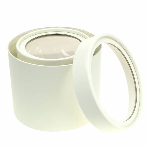 Die runde Blumenbox in Creme erhalten Sie als Set von 2 Stück. Die größere Schachtel hat dabei einen Durchmesser von ungefähr 16 Zentimetern und eine Höhe von 14 Zentimetern mit dem Deckel. Bei der kleineren Schachtel entspricht der Durchmesser rund 12,5 Zentimetern und die Höhe 12 Zentimetern.