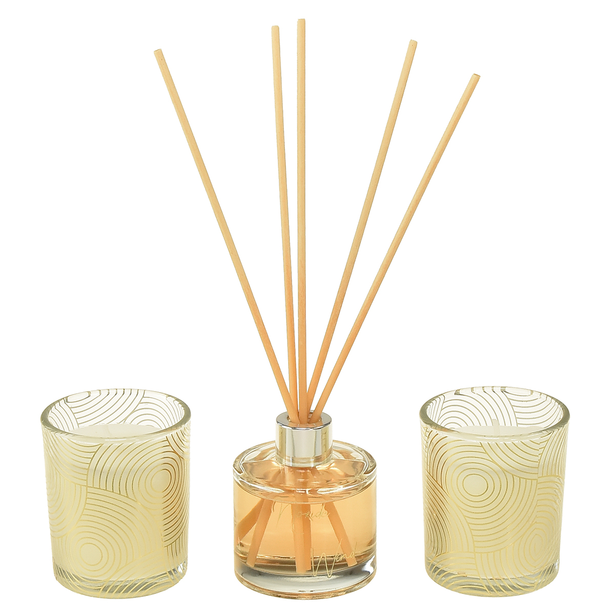 Die Duftkerze im Glas ist außen mit einem modernen Muster aus Kreisen in Golden verziert. Der Raumduft-Diffuser ist zudem mit der goldenen Aufschrift "Noride Wind” versehen. In die silbern glänzende Öffnung des Duft-Diffuser können die hölzernen Raumduftstäbchen eingestellt werden, um dann langsam den lieblichen Vanille-Duft zu verströmen.