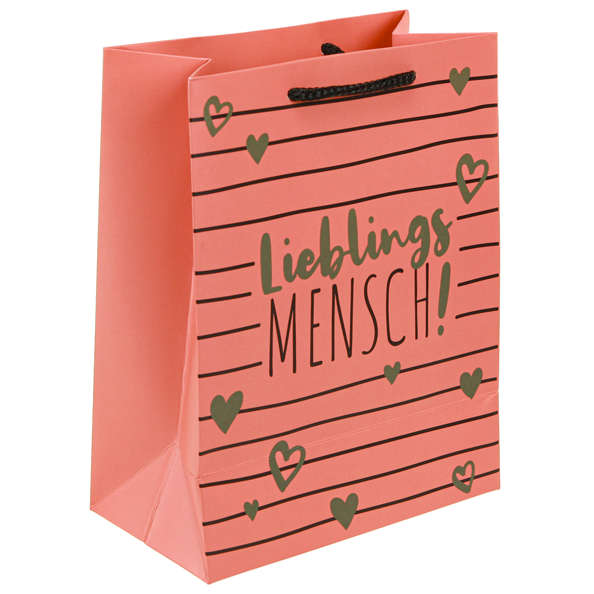 Unsere stilvolle Geschenktüte mit Herzen ist die ideale Wahl, um Ihre Geschenke liebevoll zu verpacken. Der frische korallenrote Hintergrund, verziert mit grünen Herzen und der herzlichen Aufschrift „Lieblingsmensch“, verleiht jedem Präsent eine persönliche Note. Diese robuste Papier-Geschenktüte besticht nicht nur durch ihr charmantes Design, sondern auch durch ihre qualitativ hochwertige Verarbeitung. Die stabilen Henkel aus schwarzer Textilkordel sorgen für eine bequeme Handhabung und runden das edle Erscheinungsbild ab. Ob für Geburtstagsgeschenke, kleine Überraschungen oder als romantische Geschenkverpackung – diese Geschenktasche ist vielseitig einsetzbar und damit perfekt für jeden Anlass. Ihr beschichtetes Papier und der verstärkte Boden garantieren Stabilität und Langlebigkeit. Setzen Sie Ihre Geschenke mit dieser Tragetasche gekonnt in Szene und verleihen Sie ihnen eine exklusive Präsentation.