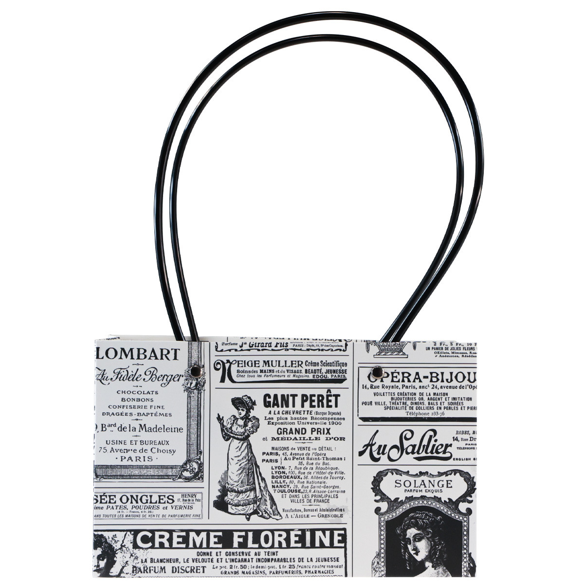 Das Design in Schwarzweiß mit den Werbeanzeigen für edle Pariser Kosmetik, Juweliere und Parfüms verleiht der Geschenktüte gleich eine besondere Aura, während die langen Griffe zusätzlich zu ihrer Eleganz sich beim Verpacken und Verschenken als praktisch erweisen.