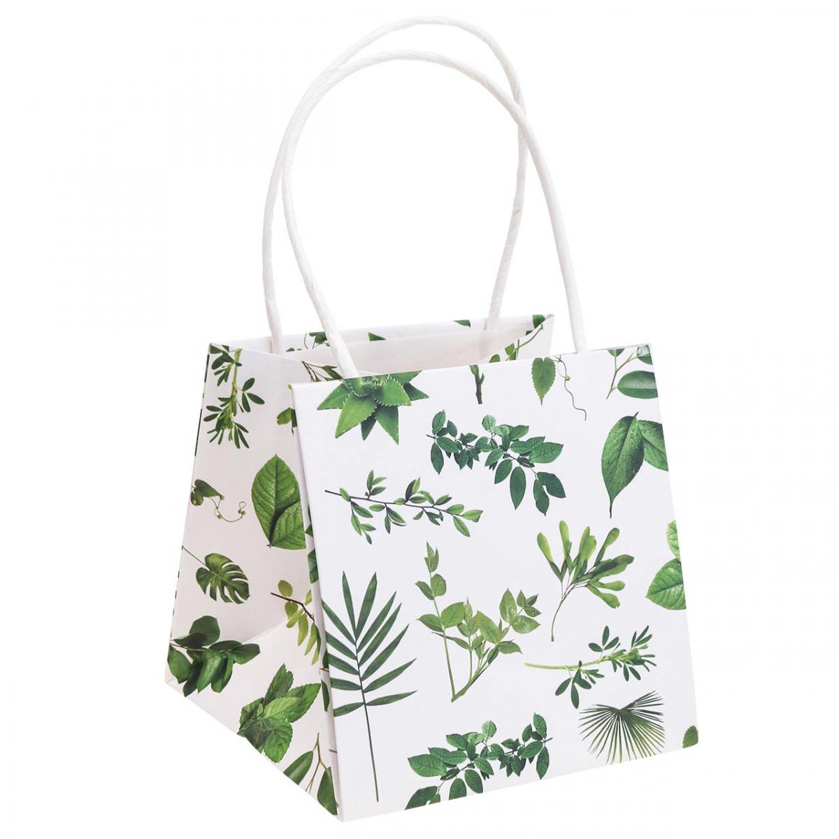 Die Deko-Taschen sind aus hochwertigem, stabilem Papier gemacht und haben zwei fein gezwirbelte Schlaufen zum Tragen. Auf der weißen Tasche sind verschiedene grüne Blattmotive zu sehen. Farn, Ahorn, Kastanie und weitere Arten sind auf den Geschenktüten aufgedruckt.