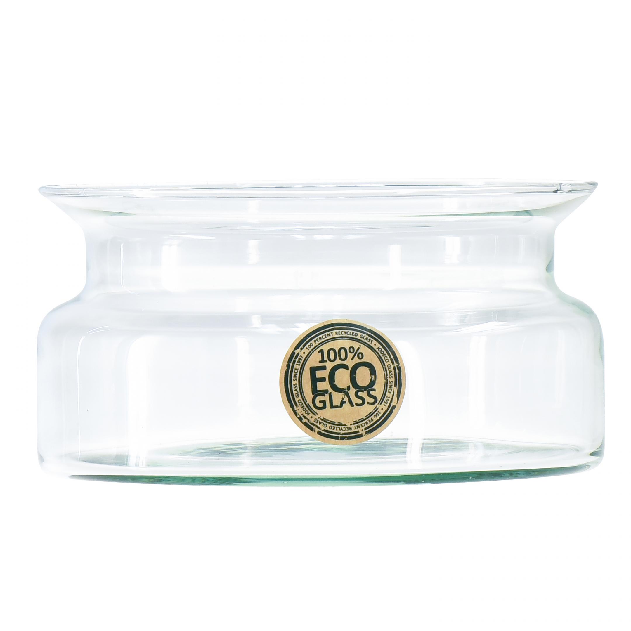 Die Schale ist so geformt, dass die obere Verengung wie ein kurzer Hals anmutet. Abwärts bis zum Boden erhält sie fast wieder dieselbe Größe wie der nach außen geneigte Rand. Und so können Sie auf einer Fläche mit einem Durchmesser von etwa 15,5 Zentimetern Ihre Deko-Ideen hinter Glas in Szene setzen.