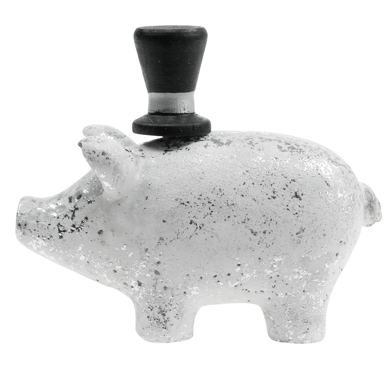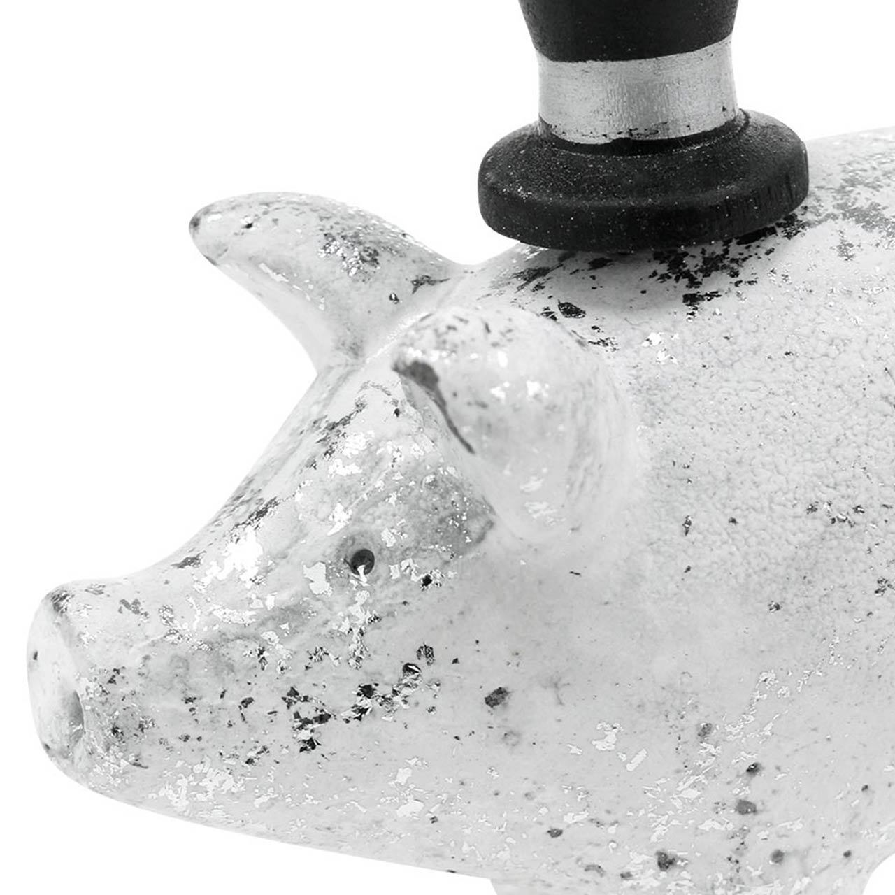 Die Dekofigur mit Shabby Charme und Zylinder ist mit Silberfarbe überzogen. Durch künstlich erzeugte Abriebspuren ist aber auch der Kunststein in Weiß und Grau zu sehen. Dadurch erhalten die tierischen Glücksbringer eine gehörige Portion Vintage-Look, der sie in der Tischdeko noch niedlicher wirken lässt. Dabei geizt das Design des eleganten Schweins nicht mit Details: So ist der Zylinderhut sogar mit einem silbernen Hutband bemalt und der Rüssel hat zwei Nasenlöcher.