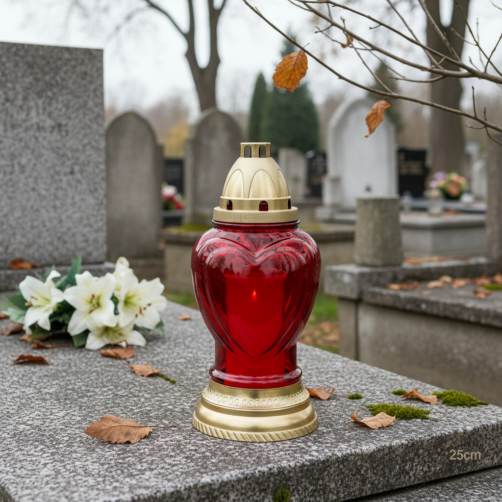 Dieses mit Herz verzierte Grablicht aus Glas ist ein ansprechendes Gedenklicht. Mit Sockel und Deckel in Form einer Kuppel ausgestattet, wirkt die Grablaterne in Rot und Gold besonders dekorativ.