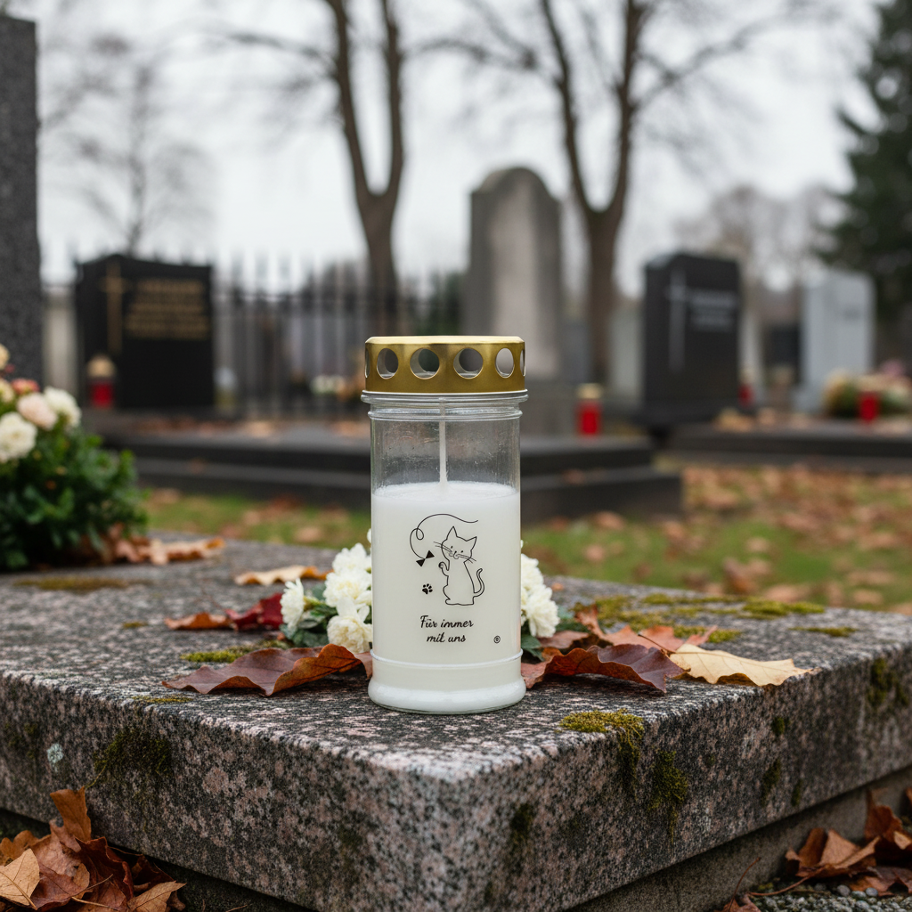 Die Verbundenheit zu unseren Haustieren lebt auch nach ihrem Weggang weiter. Mit dem Grablicht mit Katze setzen Sie ein stimmungsvolles Zeichen der Erinnerung. Die Tiergrabkerze in Weiß Gold ist nicht nur eine würdige Grabdekoration, sondern auch ein Zeichen der tiefen Liebe und des Gedenkens an eine verstorbene Katze.