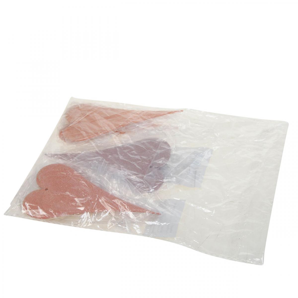 Die Deko-Herzen sind länglicher Form und kommen in zwei Orangetönen (Peach und Lachs) und hellem Lila. Die Dekoherzen zum Hängen sind mit transparentem Granulat besetzt, was die Herz-Deko fantasievoll zum Funkeln bringt. Eine Perlonschnur bildet die Aufhängung der Metall-Herzen und lässt sie in der Deko schweben.