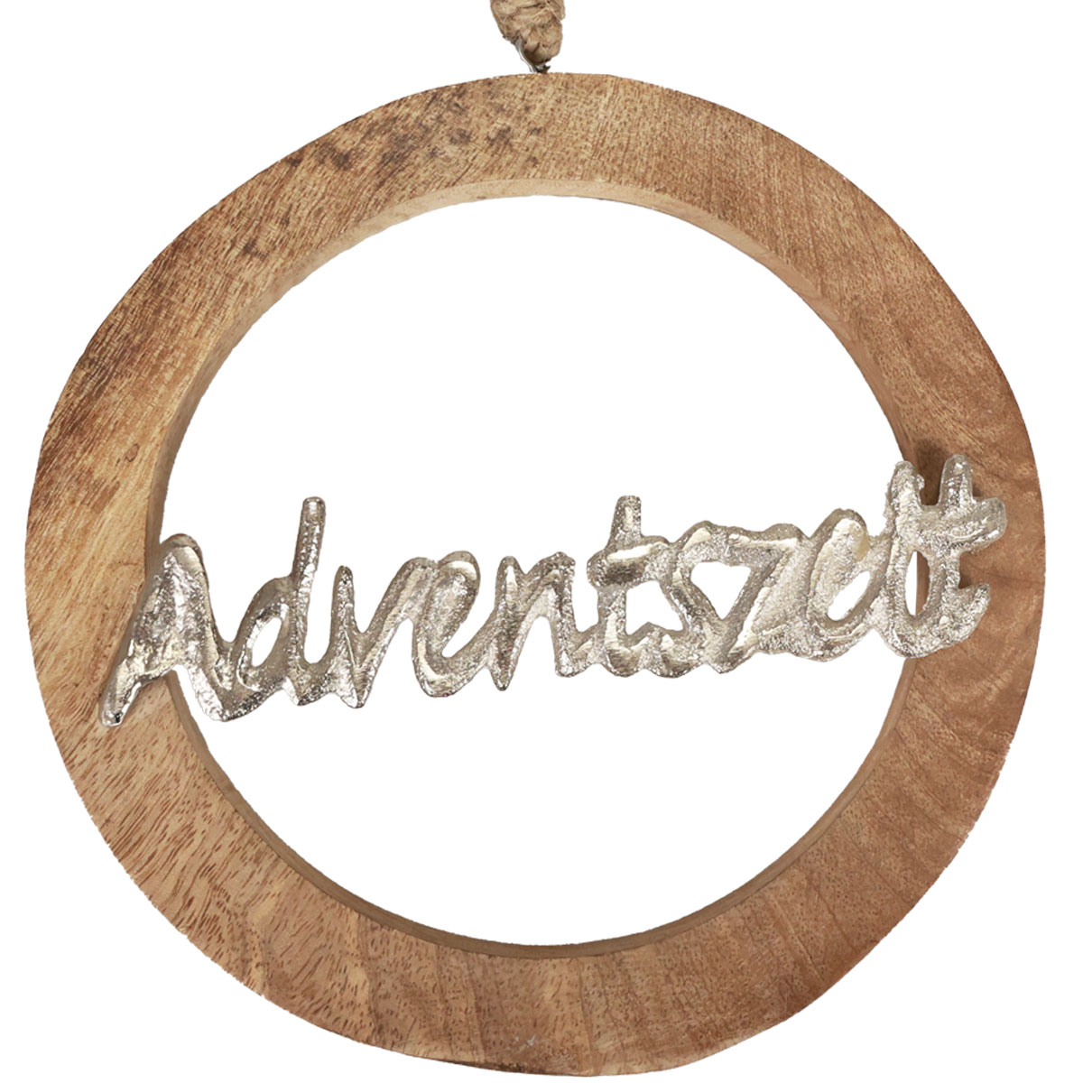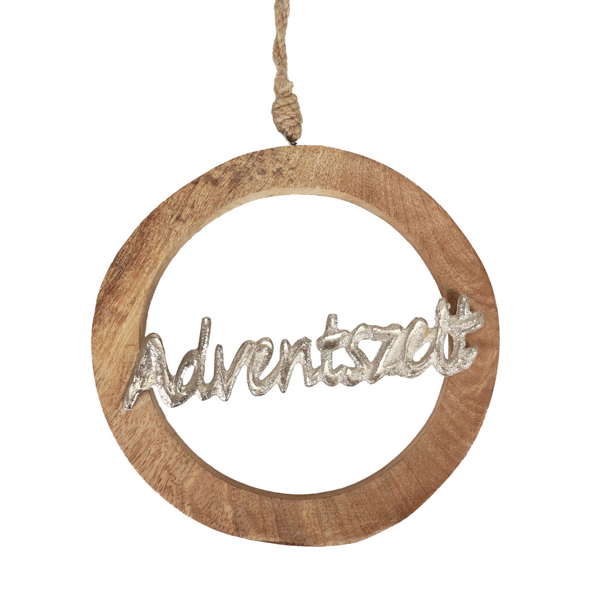 Der Holzring des Deko-Schriftzugs besteht aus natürlichem Mangoholz und bezaubert durch seine tolle Maserung. Als Aufhängung dient eine Schlaufe aus rustikaler Jutekordel, die an der Oberseite der hölzernen Adventsdeko befestigt ist, und die natürliche Optik der Weihnachtsdeko zum Hängen noch verstärkt.