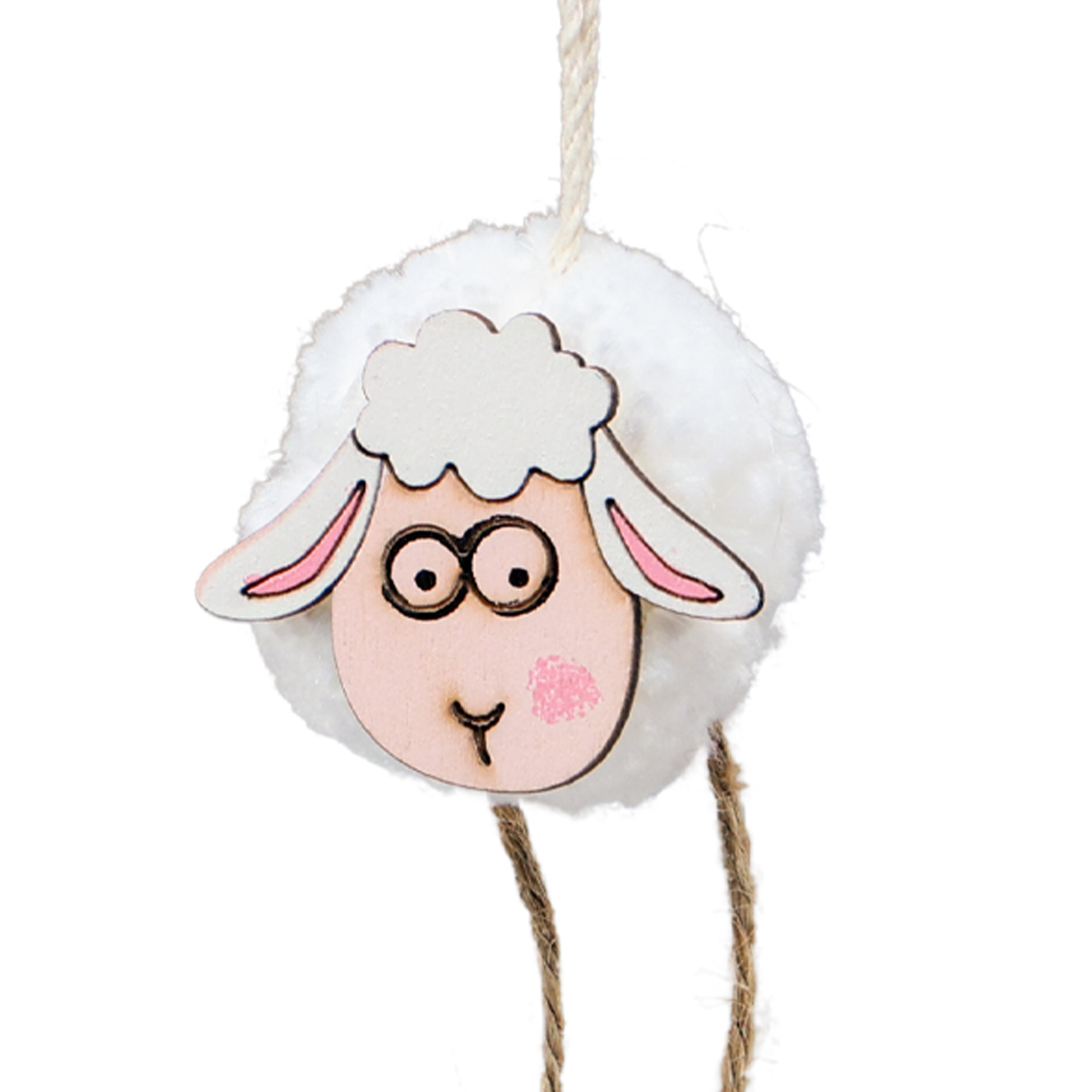 Die Schäfchen bestehen aus einem weißen Pompon, der den Körper bildet. Der Kopf wurde aus Holz gestanzt und ist unterschiedlich gestaltet. So schaut ein Anhänger-Schaf munter in die Welt, das zweite hat die Augen geschlossen und das dritte im Bunde trägt eine runde Brille und sieht damit sehr klug aus.