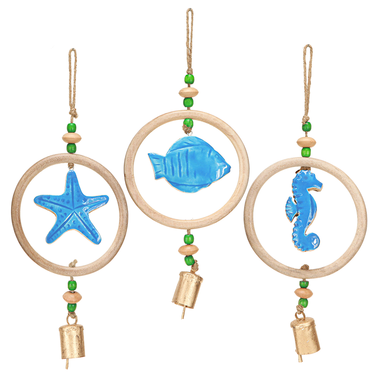 Bringen Sie mit unserer maritimen Hängedeko eine frische Brise und ein authentisches Küsten-Flair in Ihr Zuhause! Das Windspiel aus hochwertigem Mangoholz vereint natürliche Materialien mit der maritimen Farbe Blau. Die Dekoringe enthalten je eine typisch maritime Figur: einen Fisch, einen Seestern und ein Seepferdchen. Jeder dieser Ringe ist mit dekorativen Jutekordeln versehen. Oben befindet sich der Aufhänger und am unteren Ende des Rings baumelt ein goldfarbenes Glöckchen, das für ein sanftes Klangspiel bei jedem Windhauch sorgt. Die Jutekordeln sind kunstvoll mit Holzperlen in Natur- und Grüntönen geschmückt, die eine zusätzliche Naturnote hinzufügen. An einem rustikalen Juteaufhänger befestigt, eignet sich dieses Windspiel exzellent als maritime Deko zum Hängen in Ihrem Garten oder auf dem Balkon. Kombinieren Sie dieses maritime Deko-Element perfekt mit anderen maritimen Dekorationen und schaffen Sie eine harmonische und entspannte Atmosphäre. Unsere stilvolle Hängedeko aus Holz in Natur und Blau ist nicht nur ein Blickfang, sondern auch eine Einladung zum Träumen von Sandstränden und Meeresrauschen.