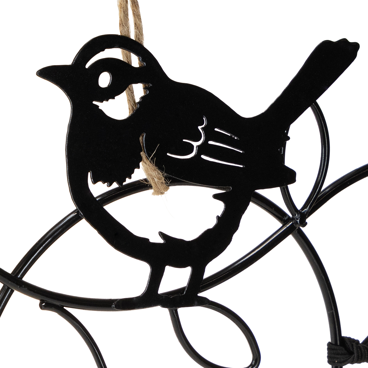 Die Deko-Vögel sitzen auf einem ovalen Ring, der von einem ebenfalls schwarzen Metallstab geteilt wird. Der Stab ist bei dieser Hängedeko an einem Gummiband befestigt. So lässt er sich praktisch herausnehmen, um einzelne Deko-Elemente wie Gräser oder kleine Hänger aus Holz einzuhängen. Auch Vogelfutter wie einen Apfel können Sie am Stab anbringen und die Metalldeko dann an einem vor Regen und Katzen geschützten Ort auf der Terrasse oder dem Balkon aufhängen.