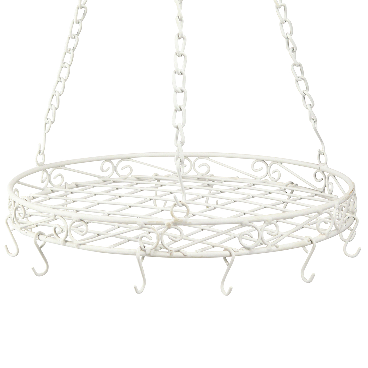 Die Hängedeko aus Metall als Tablett in Weiß ist ein Beispiel für elegante Metalldeko, die sowohl als praktischer als auch ästhetischer Hingucker dient. Mit einem Durchmesser von etwa 29,5 cm und einer Höhe von etwa 55 cm überzeugt sie durch ihr cleveres Design. Ein flacher Gitterkorb, dessen Rand durch stilvolle Aussparungen besticht, bietet mit drei Ösen Halt für Ketten. Am unteren Rand befinden sich insgesamt zwölf Haken, hervorragend geeignet für Dekobänder, Ketten oder sogar für das Arrangieren von Ranken von Hängepflanzen. Die Maschen im Gitter haben einen Abstand von etwa 3 cm, ideal zum Anordnen und Präsentieren Ihrer Lieblingsdekorationen.