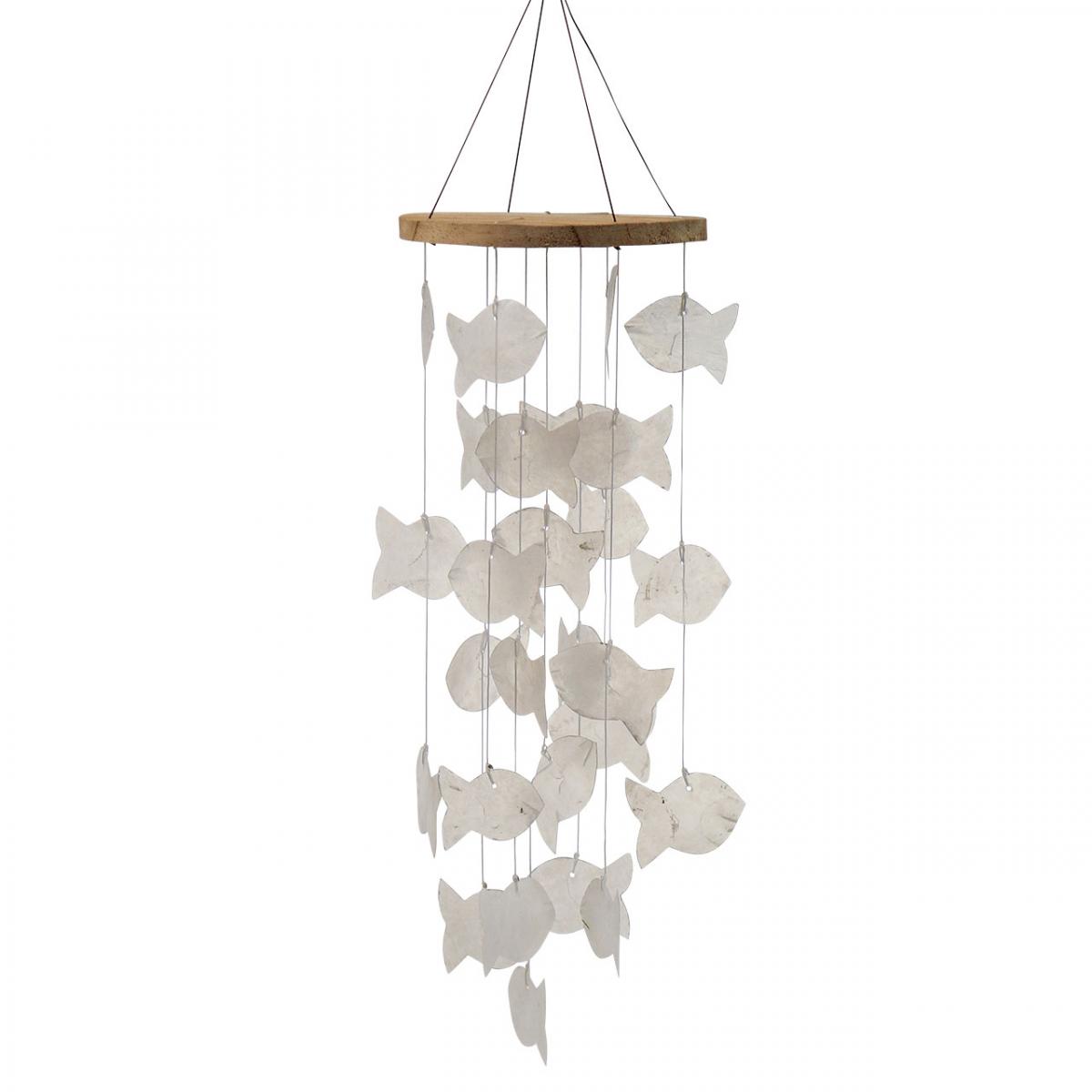 Diese Hängedeko aus Muscheln der Art Capiz ist ein tolles Windspiel für den Garten oder zu Hause. Das Besondere an diesem Capiz-Windspiel ist, dass die zarten Perlmuttscheiben in Form von Fischen gestaltet sind. Solch ein Fisch-Mobile ist für alle, die das Meer lieben, eine bezaubernde maritime Deko für jedes Zuhause oder auch als Gartendeko!Die Fische aus Capizscheiben sind in neun unterschiedlich langen Strängen an Baumwollfäden geknüpft an einer runden Holzplatte befestigt. Braune Fäden führen an der Oberseite zu einem Metallring zusammen, an dem die maritime Hängedeko bequem aufgehängt werden kann.