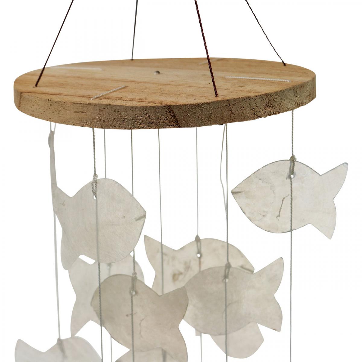 Die Fische aus Capizscheiben sind in neun unterschiedlich langen Strängen an Baumwollfäden geknüpft an einer runden Holzplatte befestigt. Braune Fäden führen an der Oberseite zu einem Metallring zusammen, an dem die maritime Hängedeko bequem aufgehängt werden kann.