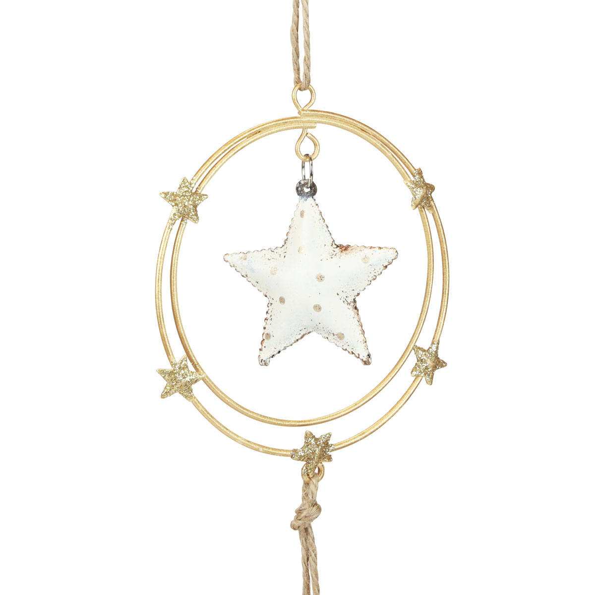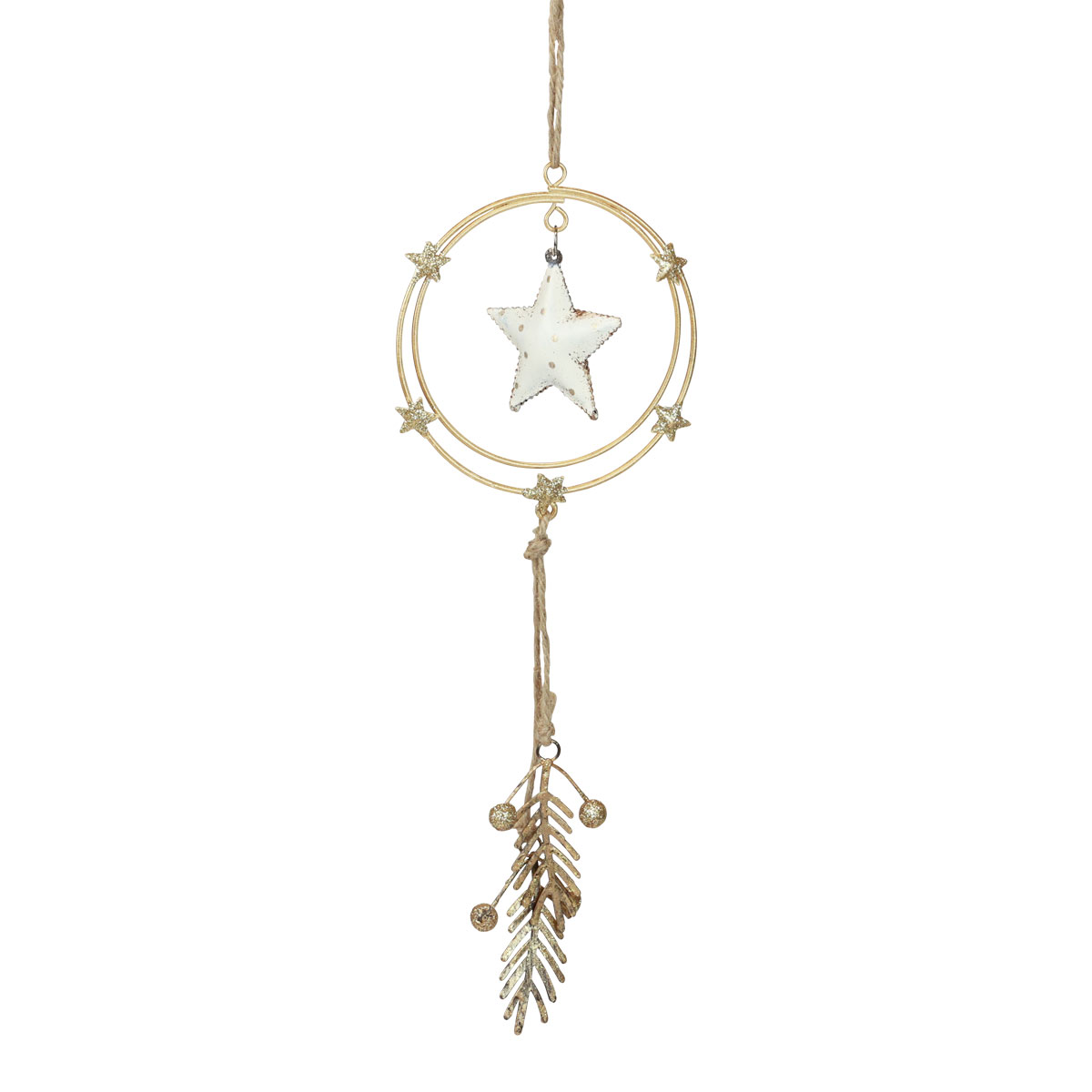 Der Dekohänger besteht aus einem goldenen Ring mit golden gepunktetem Stern aus Metall, glitzernd goldenen Beeren und filigran gestalteten Tannenzweigen. Auch auf dem Dekoring selbst sind noch kleine Glitzersternchen angebracht – eine rundum festliche Hängedeko für Weihnachten!