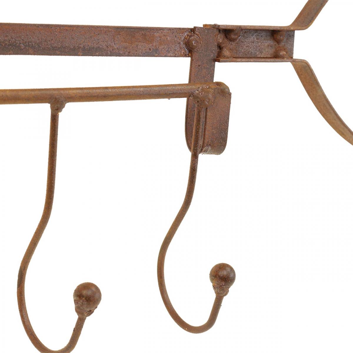Die Hakenleiste der Edelrost-Deko ist mittig angebracht und macht zirka 21 Zentimeter der gesamten Garten- und Balkon-Deko aus. Der Griff ist mit einem schmalen Rohr ummantelt, das Sie beliebig drehen können.