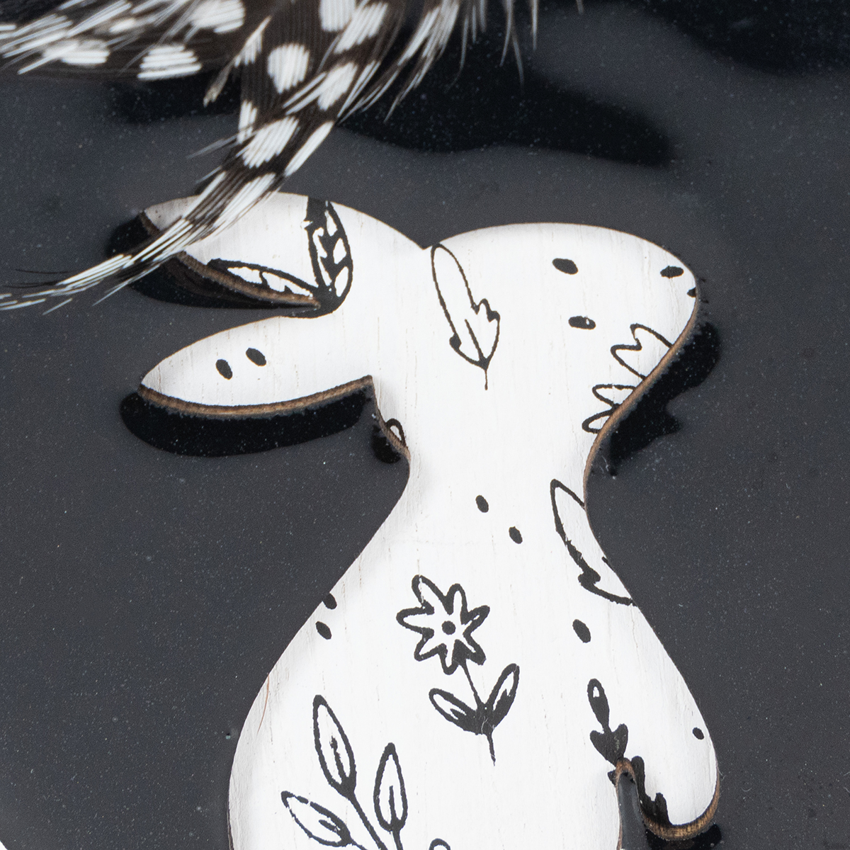 So viel Detail auf kleinem Raum! Drei verschiedene Motive lassen sich beim genaueren Hinschauen erkennen. Das weiße Ei zeigt einen sitzenden Hasen mit schwarzen Blumen auf naturfarbenem Hintergrund. Das naturfarbene Ei umgibt stattdessen einen laufenden Hasen mit weißen Blumen auf schwarzem Hintergrund. Das schwarze Ei hingegen umrahmt einen stehenden Hasen mit schwarzen Blumen auf weißem Hintergrund.
