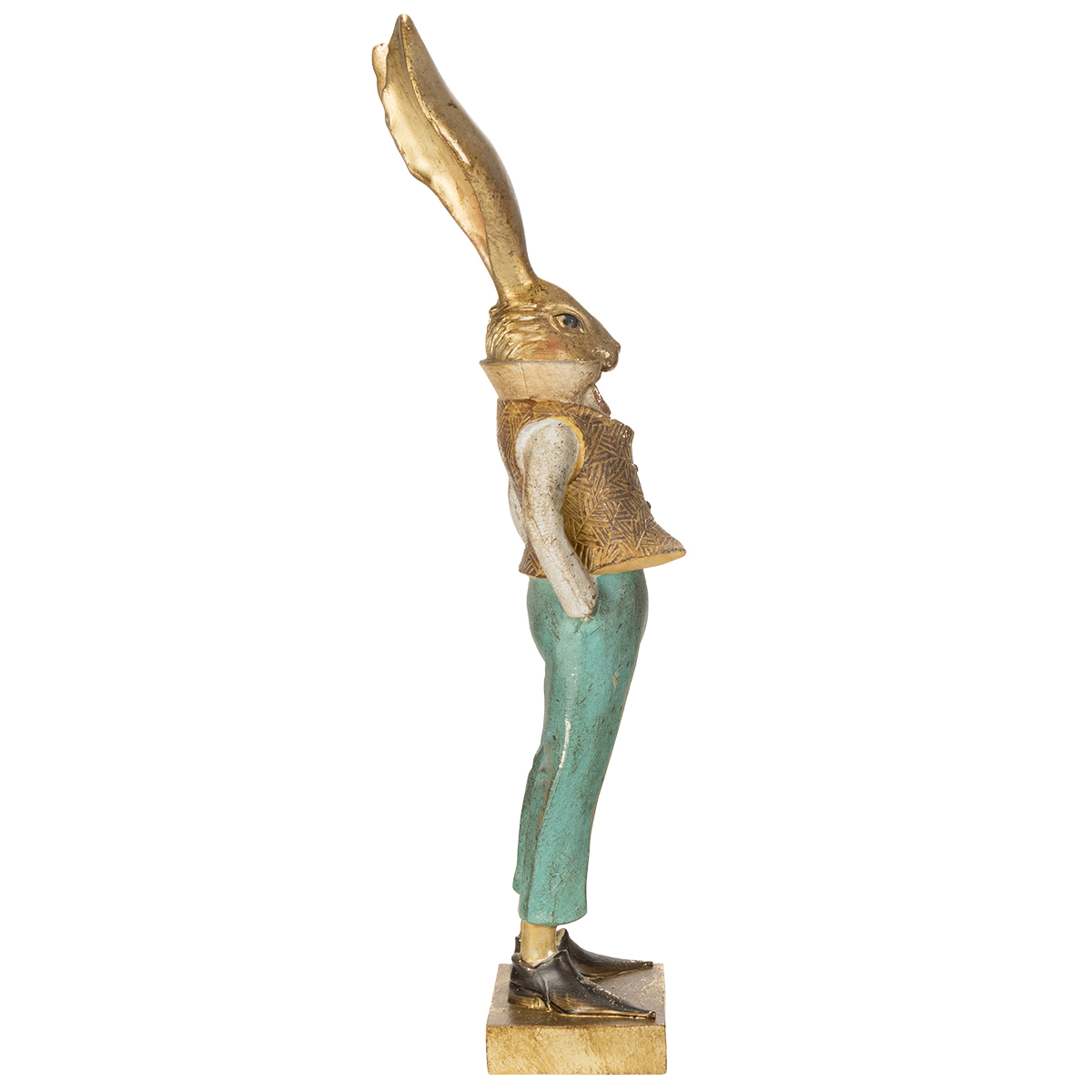 Diese Hasenfigur besticht durch ihr harmonisch abgestimmtes Design. Der warme Braunton des Körpers und das zarte Grün der Hose schaffen einen angenehmen Kontrast, der zugleich modern und zeitlos wirkt. Besonders die polierten Details des Polystones lassen diese Figur kräftig und lebendig erscheinen. Haben Sie schon bemerkt, wie liebevoll die kleinen Akzente gesetzt sind? Vom charmanten Gesichtsausdruck bis hin zu den goldenen Akzenten auf seinem Outfit – hier trifft klassische Osterdeko auf modernen Chic.