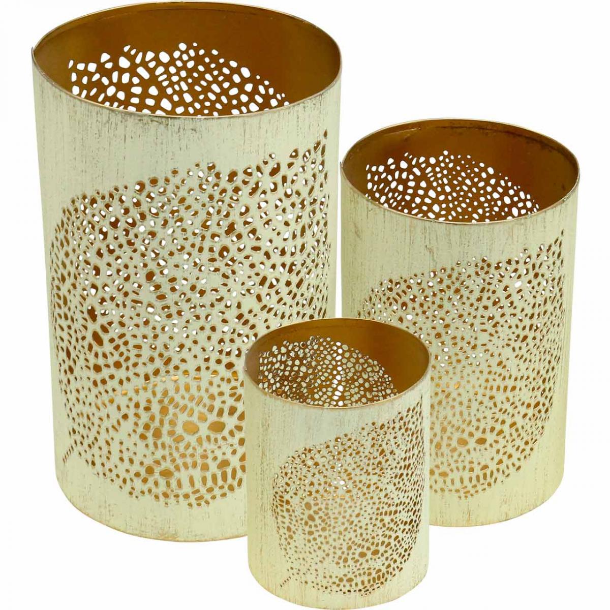 Sie erhalten die Windlichter aus Metall im Vintage-Stil im Set zu drei Stück in unterschiedlicher ineinander stapelbarer Größe.