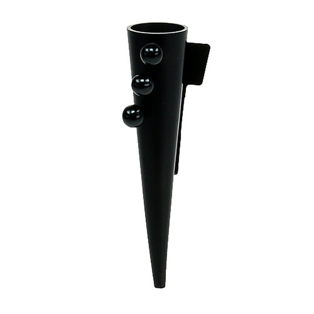 Damit ein kleines Blumenarrangement in den konisch geformten Hochzeitsanstecker passt und auch nicht herausfällt, gehören zu dem Hochzeitsaccessoire noch drei Nadeln mit schwarzen, runden Köpfen, die schräg von oben nach unten in Löcher gesteckt werden; diese fixieren dann den Blumenschmuck. Durch die schwarze Farbe passt der Anstecker am besten zu einem weißen Anzug, punktet aber genauso edel an einem schwarzen, cremefarbenen oder blauen Anzug aussieht.