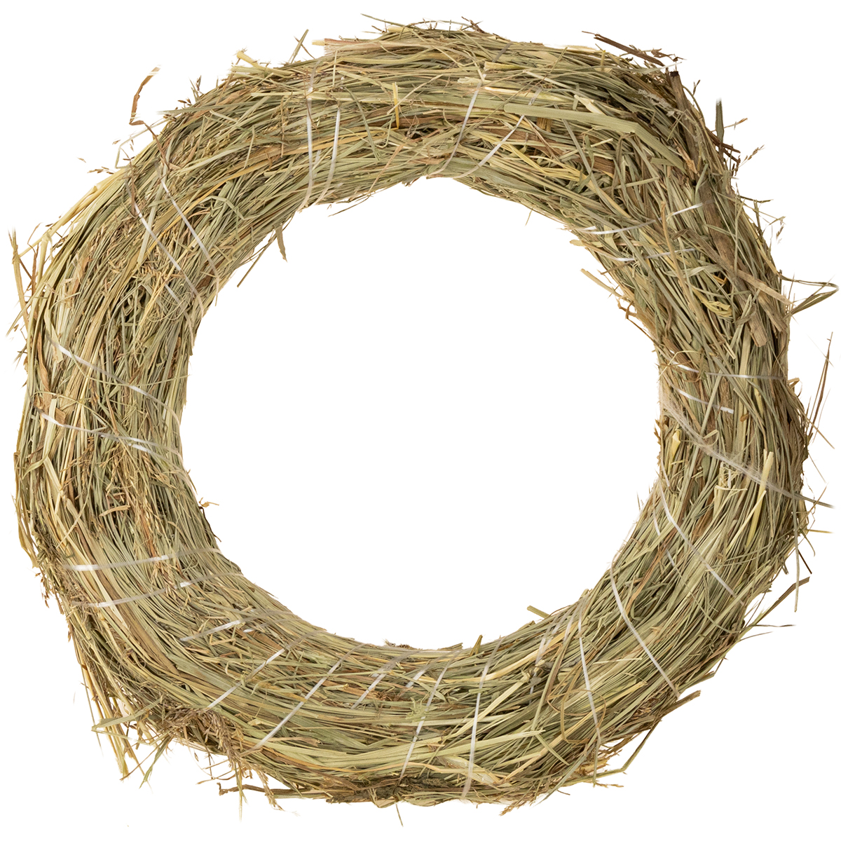Die Heukränze sind als Paket zu insgesamt 5 Stück zusammengeschnürt und sind alle per Hand hergestellt. Dafür wurde hochwertiges Heu ausgesucht, das dann zu einem Ring gerollt und anschließend mit einer Nylonschnur in Form gebunden ist. Deswegen können die Maße auch immer leicht abweichen; so besitzen die Kränze einen Außendurchmesser, der ungefähr zwischen 26 und 27 Zentimeter liegt. Der Innendurchmesser beträgt dabei circa 19 Zentimeter und die Höhe in etwa 4 Zentimeter.