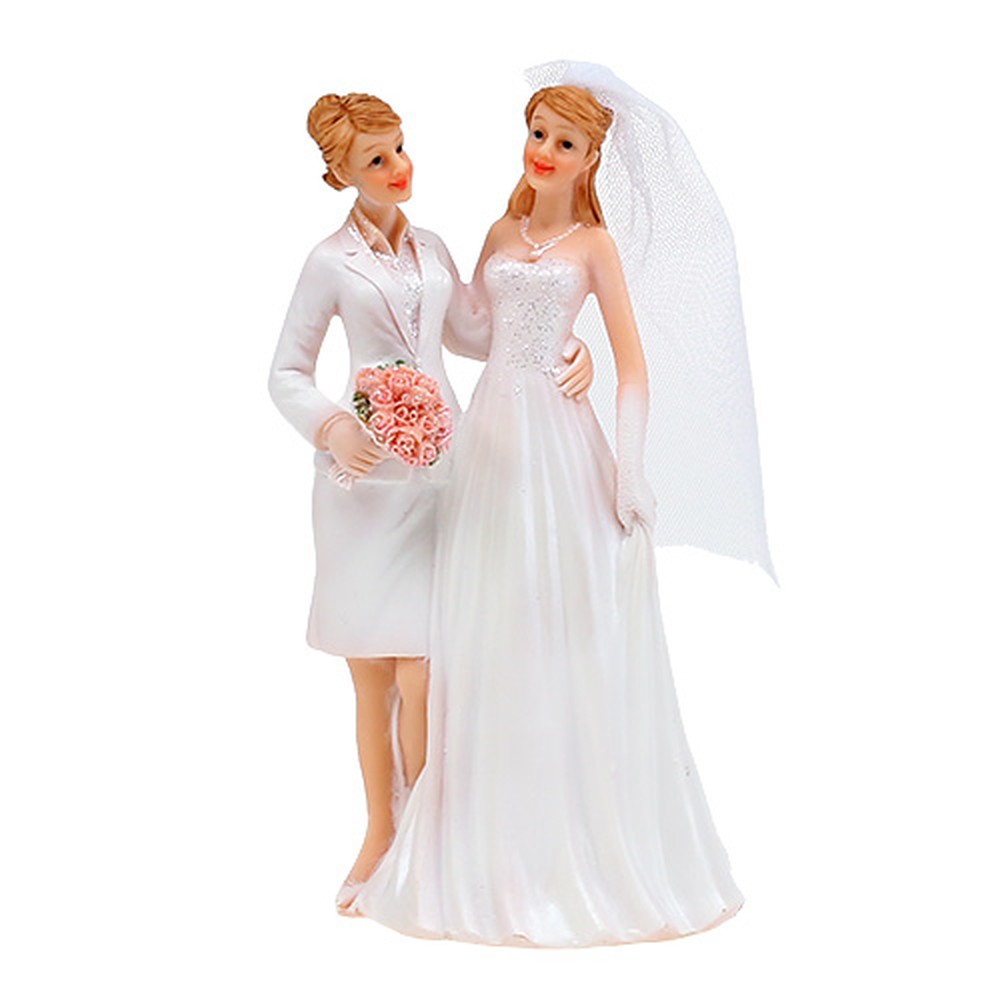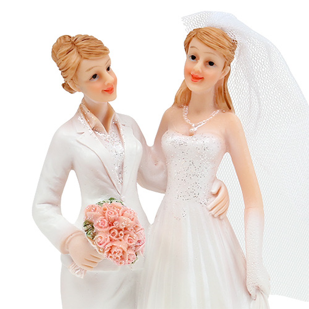 So steckt die eine Dame in einem eleganten Hochzeitskleid, dessen Oberteil mit leuchtendem Glitter versehen ist. Dazu trägt sie einen süßen Schleier aus Organzastoff, während ihre Angetraute ein edles Kostüm und den romantischen Rosenstrauß trägt. Dazu sind Ihre beiden Gesichter, Haare und die Falten der Kleidungstücke ebenfalls sehr detailliert herausgearbeitet.