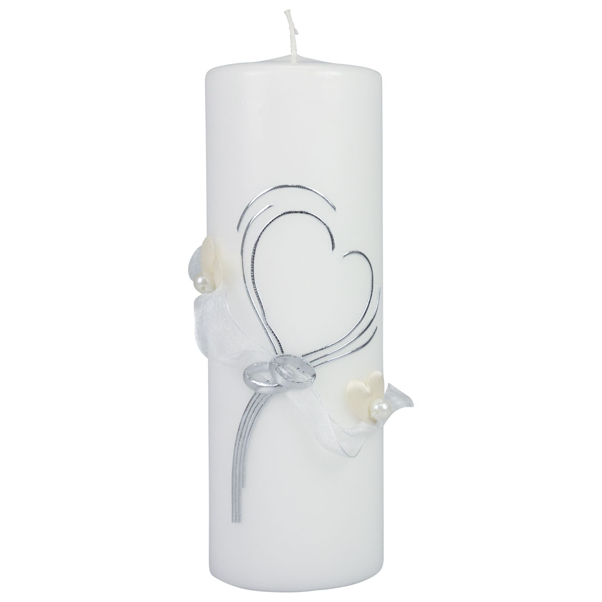 Produktname: Festliche Hochzeitskerze mit stilvollem Herz-Design, Silberverzierungen und Organza-Band – Ideal für Hochzeit und Silberhochzeit, 240/80mm