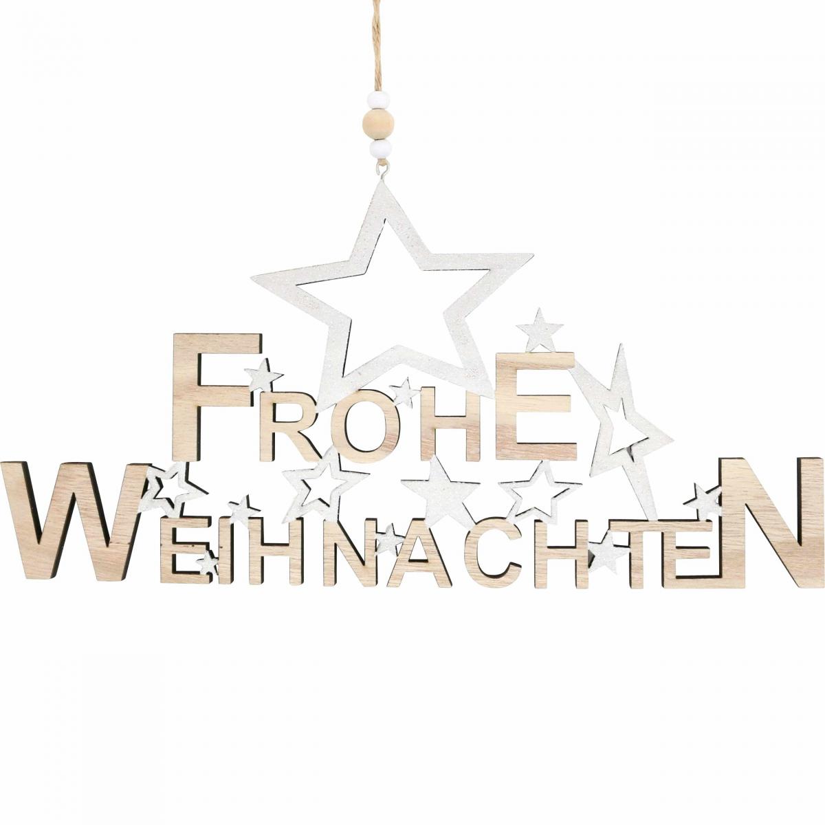 Produktname: Holzdeko Frohe Weihnachten, Sterndeko, Dekohänger Advent Natur, Weiß H15cm B30cm 2 St