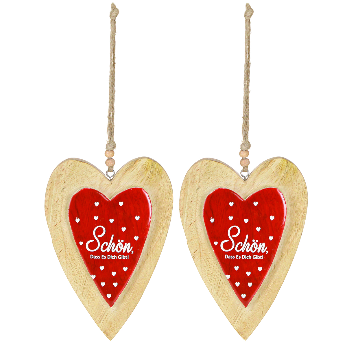 Unsere bezaubernde Holzherzen-Deko in Natur, Rot und Weiß ist die perfekte Ergänzung für Ihr Zuhause. Diese wunderschöne Herz-Deko bringt einen Hauch von Vintage-Romantik in jeden Raum. Die beiden Herzanhänger aus Holz sind mit der liebevollen Botschaft "Schön, dass es dich gibt" in Weiß auf rotem Hintergrund verziert. Diese Deko-Herzen verleihen jeder Umgebung eine warme und einladende Atmosphäre. Hergestellt aus hochwertigem Holz, sind diese Holzherzen nicht nur eine stilvolle, sondern auch eine nachhaltige Dekoration. Mit ihrer silberfarbenen Metallöse und der Jutekordel sind sie einfach an Türen, Wänden oder Sträuchern zu befestigen. Die kleinen weißen Herzen auf der roten Beschichtung fügen eine zusätzliche Raffinesse hinzu, die sich wunderbar in verschiedene Einrichtungsstile wie Landhaus, Shabby oder Vintage einfügt.