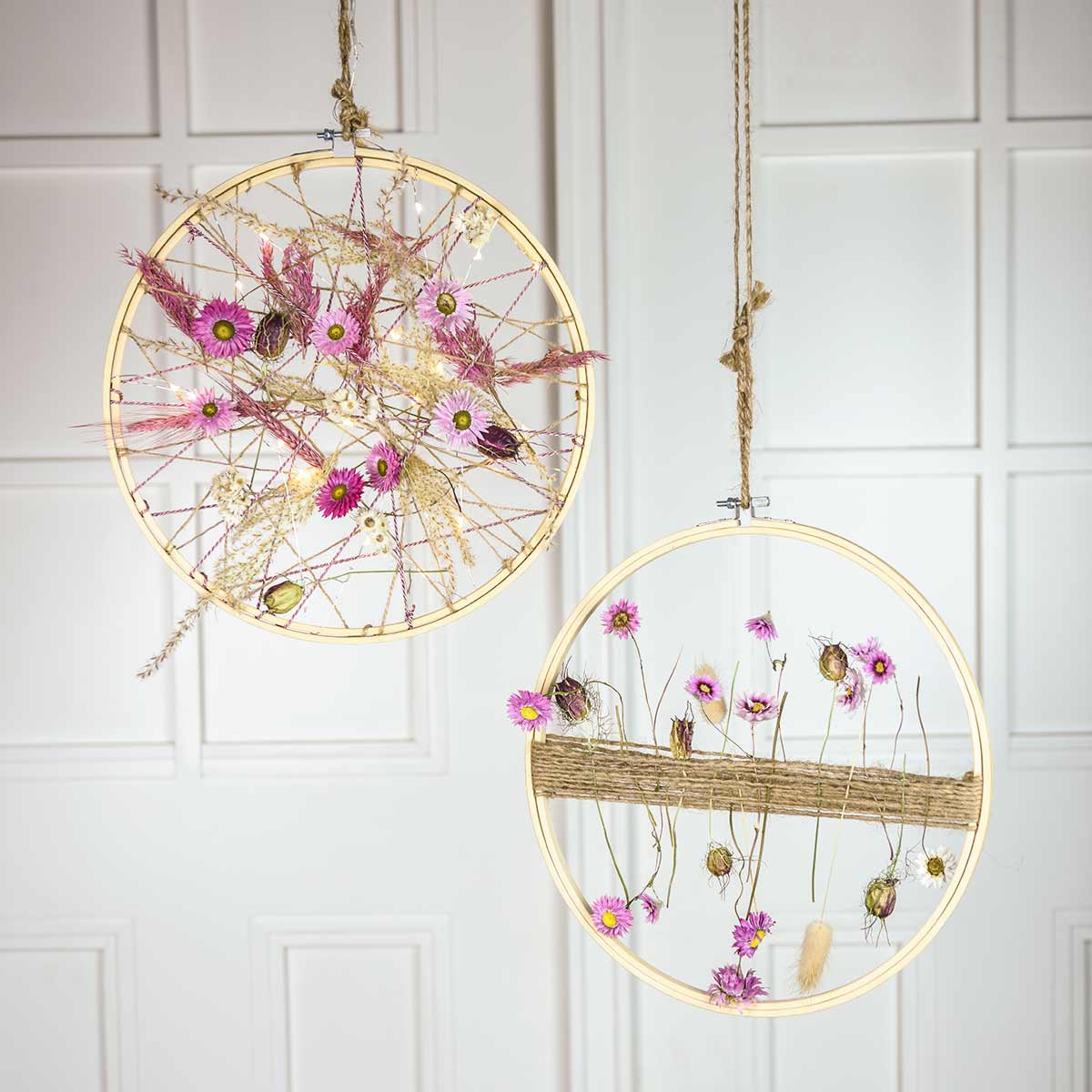 Floristen können mit dem Stickring im Handumdrehen ansprechende Dekorationen im angesagten Boho-Stil gestalten. Nutzen Sie den Holzring zum Dekorieren als Bilderrahmen oder Gestell für kunstvolle Makramee-Arbeiten. Natürlich können Sie den Holzrahmen auch einfach mit Stoff oder Gardine bespannen und Stickarbeiten darauf anfertigen. – Aber auch Bastelarbeiten mit Trockenblumen zum Beispiel mit einlaminierten gepressten Blüten bietet der Deko-Stickrahmen einen schönen Rahmen!