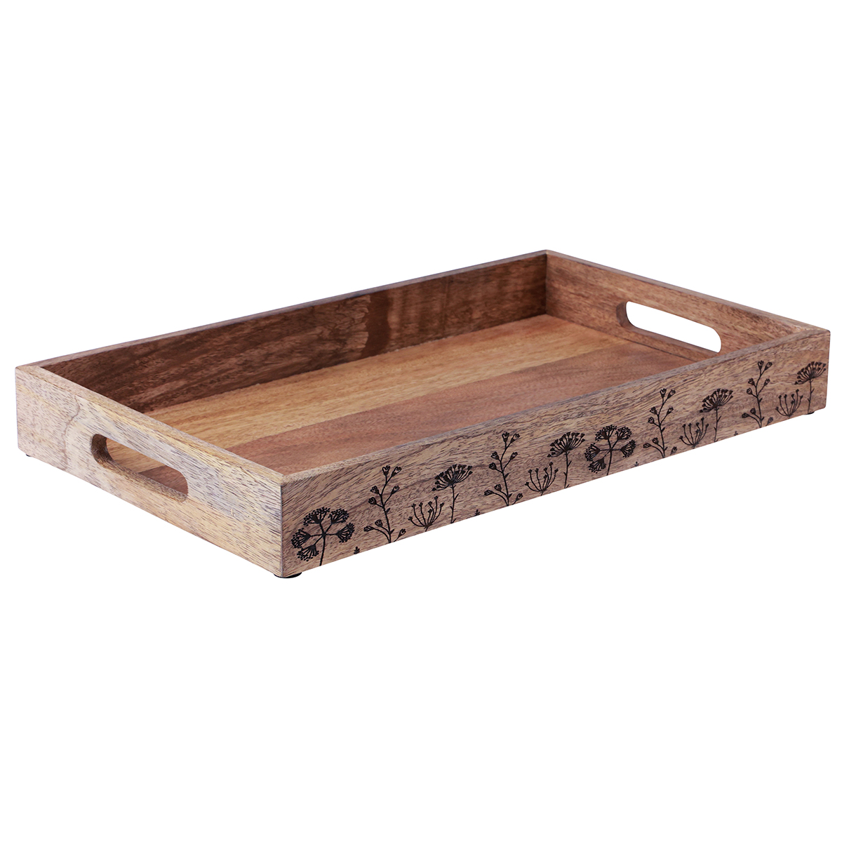 Das schlichte Design als rechteckiges Tablett wird durch das wie gebrannte Wiesen-Motiv auf echtem Mangoholz geradezu veredelt.