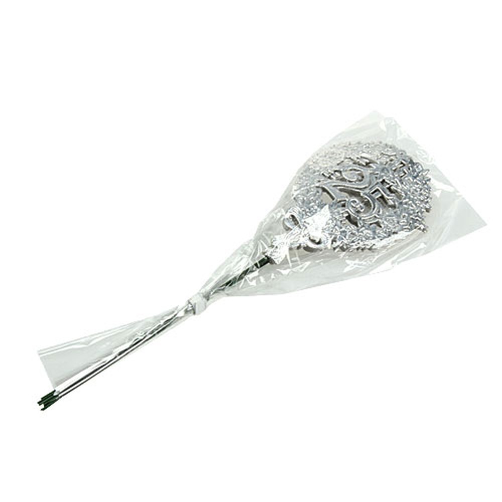 Die silberne Jubiläumszahl „25“ wird in einer Packung mit 10 Stück geliefert. Jeder Dekostecker zum Jubiläum hat eine Gesamtlänge von rund 28 Zentimetern. Das Emblem, welches aus geprägtem Karton hergestellt wurde und die „25“ zusammen mit einem Kranz und einer Schleife zeigt, hat in etwa die Maße 8 mal 12 Zentimeter. Wobei die Ziffer an sich ungefähr 3,3 x 3,5 Zentimeter misst.