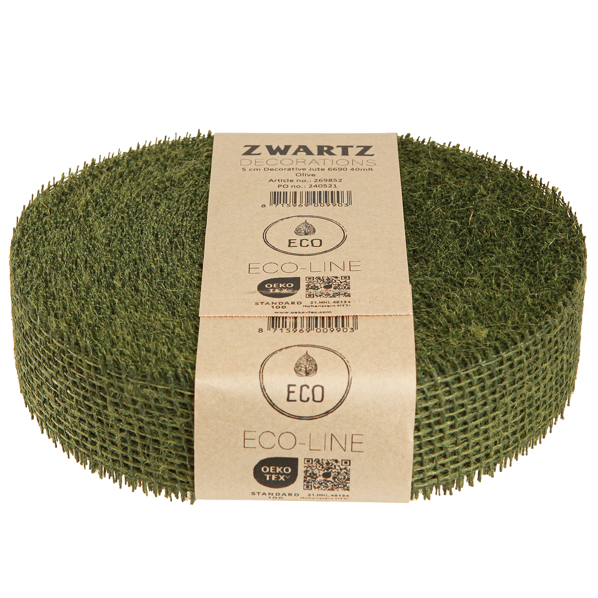 Das Juteband in Olivrgrün hat als Rolle gewickelt eine Gesamtlänge von circa 40 Metern, wobei die Breite in etwa 5 Zentimeter beträgt.