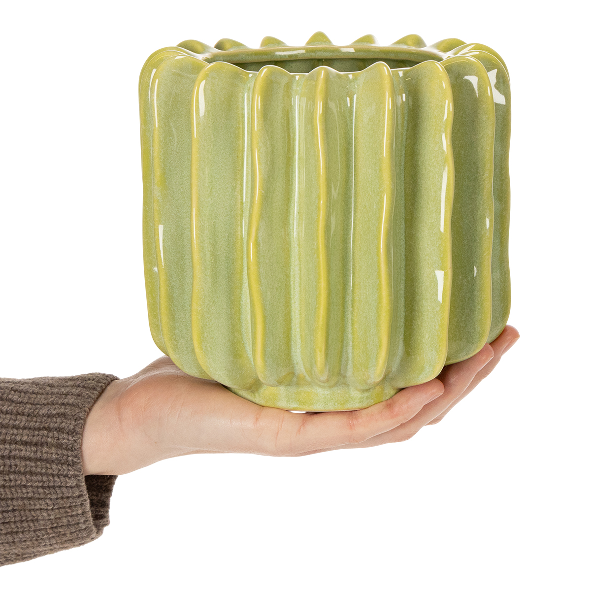 Die hochwertige Keramik und das griffige, gerillte Design machen diesen Übertopf nicht nur praktisch, sondern auch zu einem stilvollen Einrichtungselement. Er bietet ausreichend Platz für Ihre Lieblingspflanzen – sei es ein Kaktus, eine Sukkulente oder eine kleine Grünpflanze. Ob im Boho-Stil, im minimalistischen Wohnkonzept oder im Urban-Jungle-Look: Dieser Design-Blumentopf passt sich nahezu jeder Einrichtung an und wird garantiert zum Gesprächsthema.