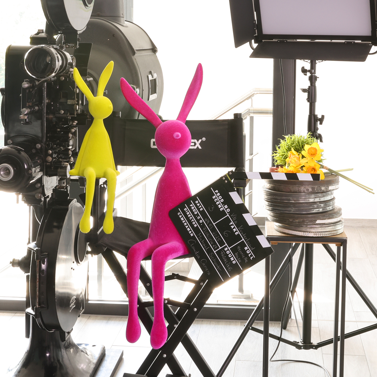 Der beflockte Kantenhocker als Osterhase in Pink: eine stilvolle Osterdekoration