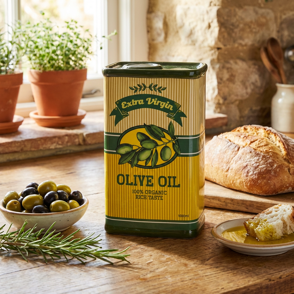 - Farbe: Sattes Grün mit Retro-Print im Olivenöl-Design