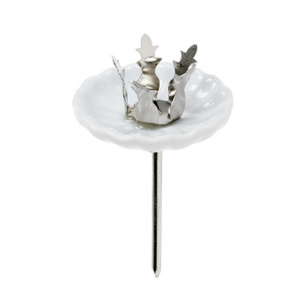 Der Kerzenhalter für Baumkerzen in Silber und Weiß kommt in einem 4er-Set und besitzt eine Gesamthöhe von circa 7cm. Die Kronen haben jeweils einen Durchmesser von ca. 4cm und sind etwa 2cm hoch. Die Spitzen der Kronen sind leicht nach außen gebogen und elegant gezackt.