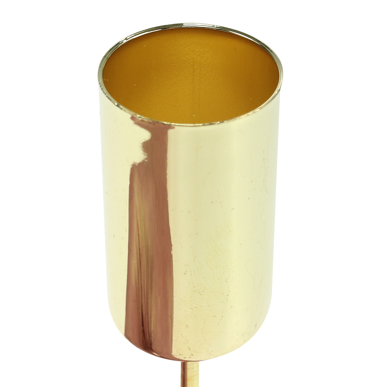 Die Kerzenhalter für Stabkerzen in Gold werden in einem Beutel zu insgesamt 4 Stück geliefert. Die Gesamthöhe beträgt ungefähr 11 Zentimeter, wovon der Behälter etwa 4 Zentimeter hoch ist. Der Innendurchmesser beträgt circa 2,2 Zentimeter.