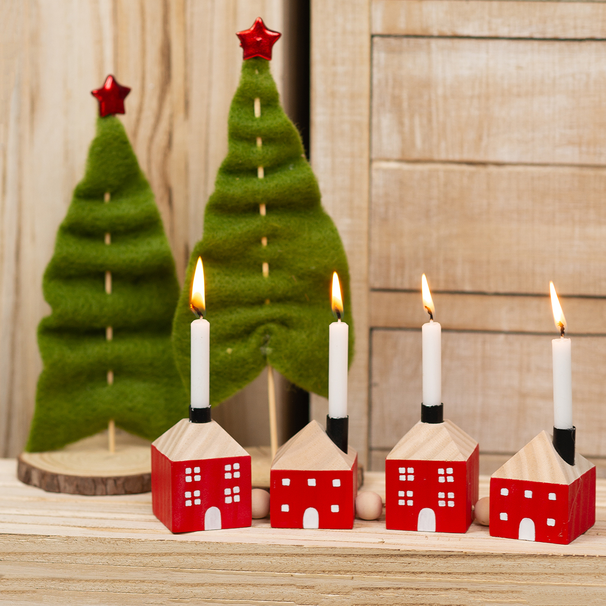 Kerzenhalter auf Holz-Deko: vier niedliche Holzhäuschen in Rotweiß