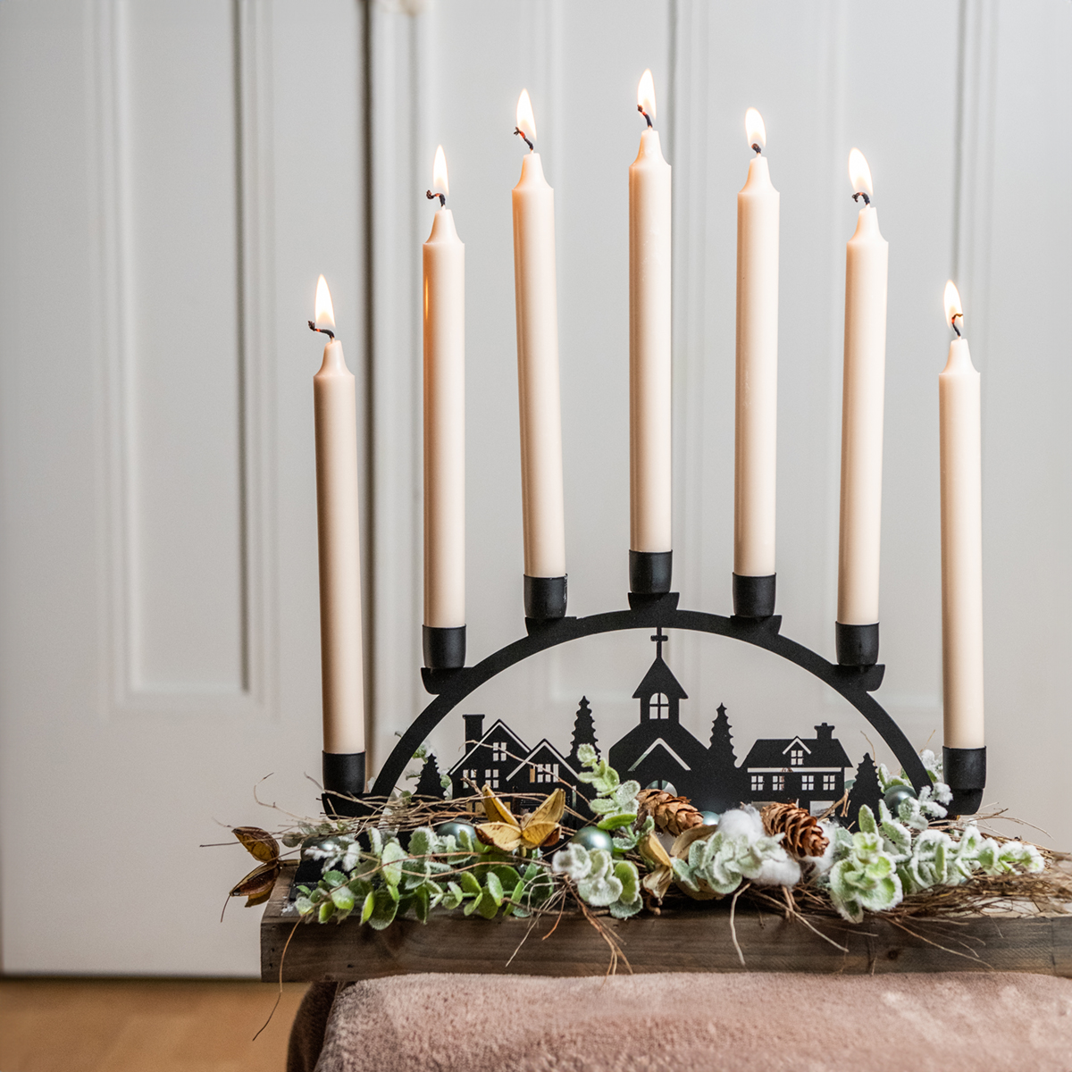 Der Schwibbogen wird besonders gern als Fensterdekoration abends ins Fenster gestellt und erzeugt Behaglichkeit und weihnachtliche Atmosphäre. Die passenden Stabkerzen in schönen Farben finden Sie bei uns im Shop.