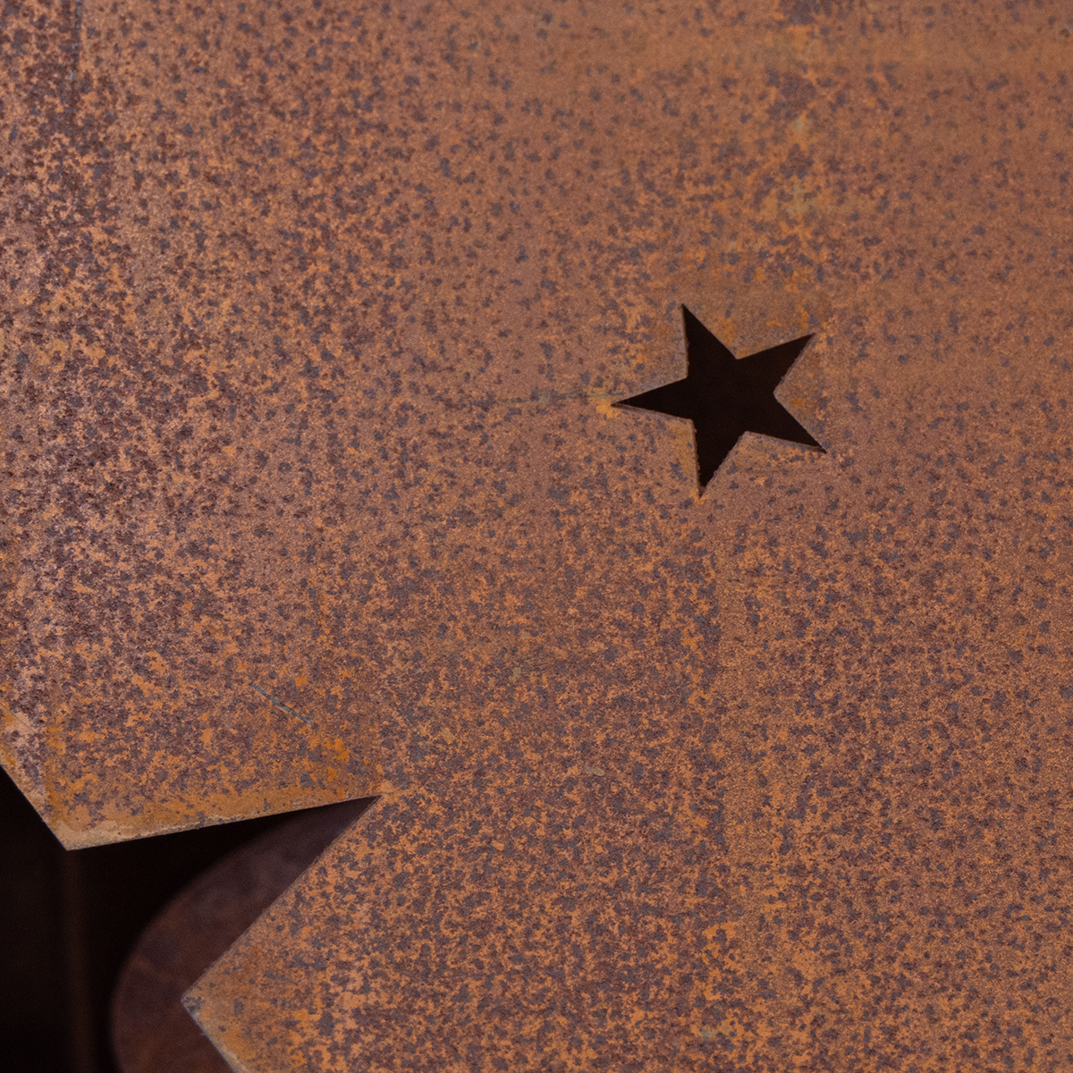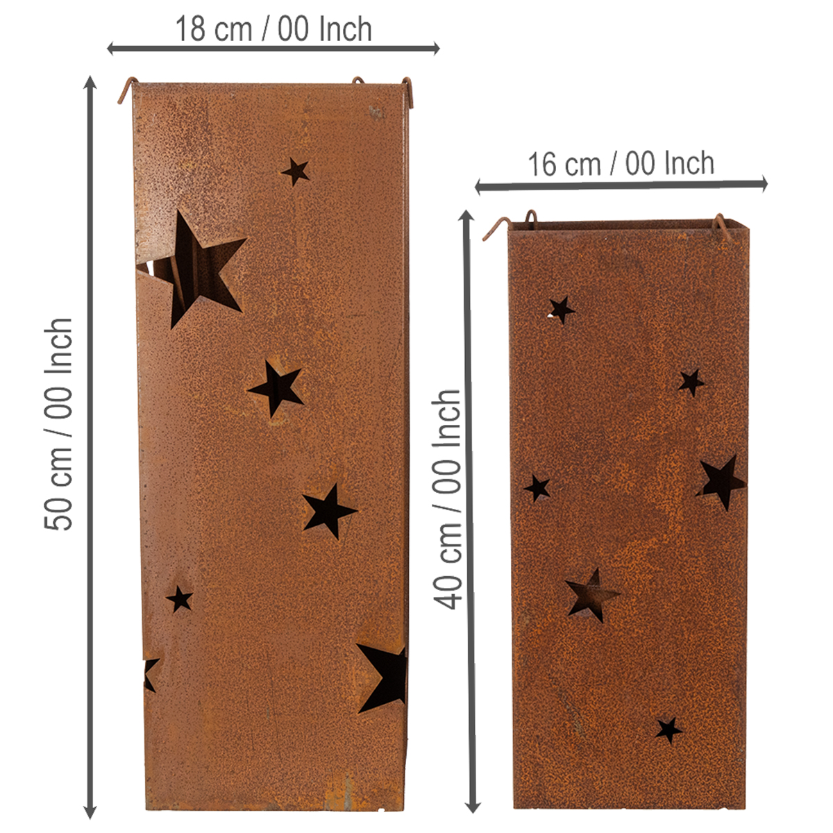 Diese Kerzenhalter erhalten Sie im Zweierset in einer Höhe von 50 Zentimetern und 40 Zentimetern. Bringen Sie Ihren Balkon oder Ihre Terrasse mit den Sternen in der Edelrost-Deko zum Leuchten.