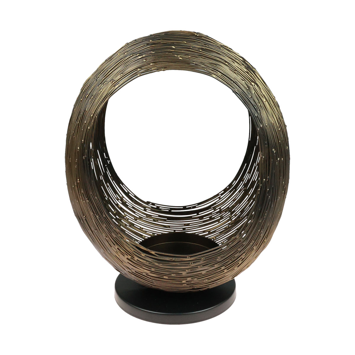 Wie eine moderne Skulptur mutet dieser Kerzenleuchter aus Metall an. In Ellipsen-Form gestaltet, ist diese Metall-Deko mit Teelichthalter ein echter Blickfang in Kupfer und Schwarz.Die Skulptur inspiriert sich an Werken zeitgenössischer Kunst. Selbst ohne Teelichthalter ist diese Metall-Deko bereits ein imposantes Accessoire für Kommode oder Schaufenster. Doch natürlich wirkt dieser Kerzenleuchter umso effektvoller, wenn Sie ein großes Teelicht oder eine gekürzte Stumpenkerze in der unten zentral angebrachten Halterung entzünden.
