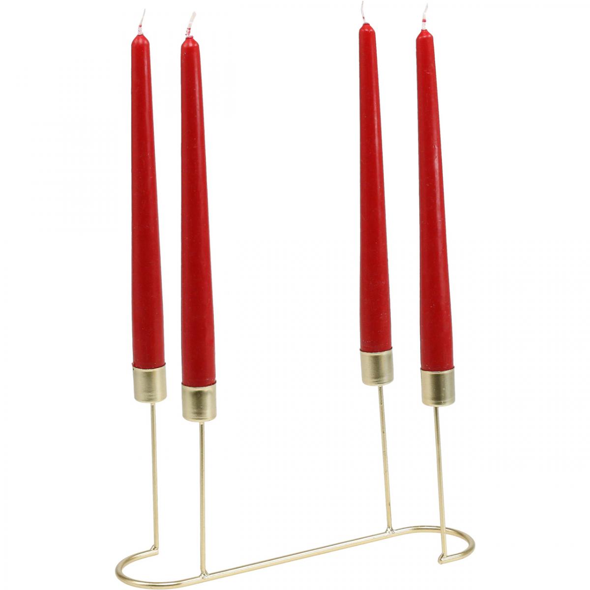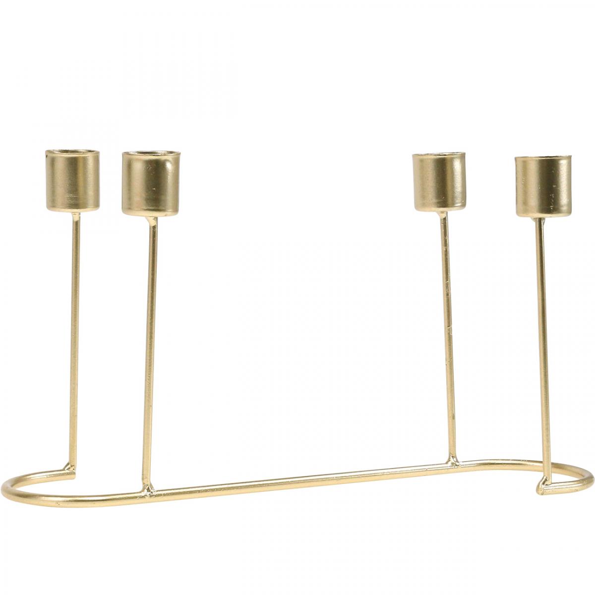 Der Stabkerzenhalter besitzt einen s-förmig geschwungenen Standfuß und vier elegante hohe Kerzenhalter aus Metall, die trapezförmig angeordnet sind.