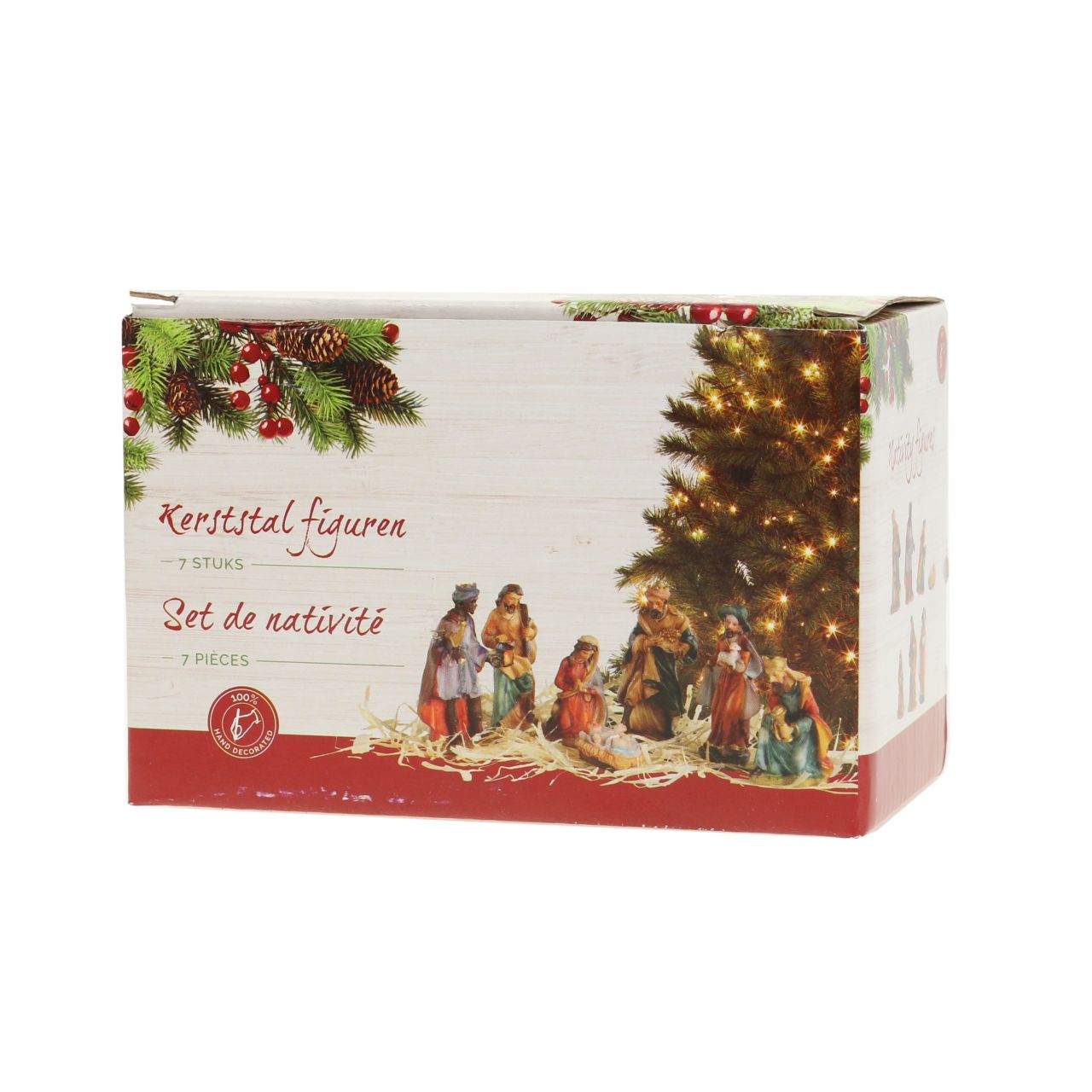 Die handbemalten Krippenfiguren bestehen aus Kunststein beziehungsweise Polyresin. Das Set enthält die folgenden 7 Figuren der klassischen Weihnachtserzählung: das Jesuskind, Maria, Josef, einen Hirten, Melchior, Balthasar und Caspar. Die Größe reicht von etwa 2 Zentimetern bis etwa 9 Zentimeter.