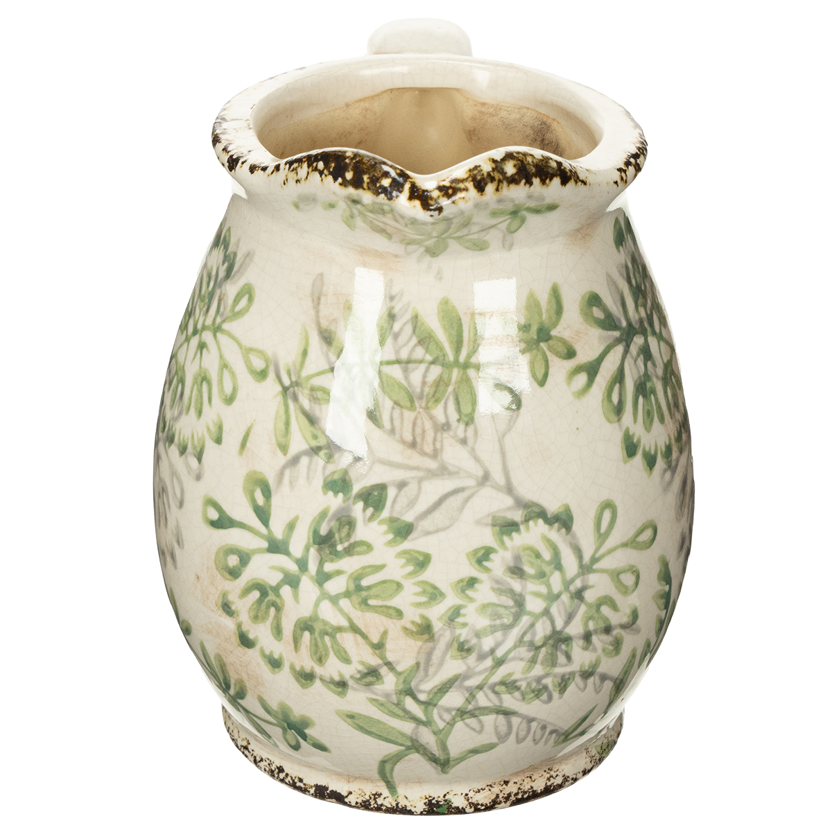 Sie lieben den Charme vergangener Zeiten und möchten etwas Vintage-Atmosphäre in Ihr Zuhause bringen? Dann ist dieser bezaubernde Krug zum Bepflanzen im Vintage Look genau das Richtige für Sie! Er vereint nostalgischen Charme mit praktischer Funktionalität und wird zum absoluten Hingucker in jeder Einrichtung. Der Keramik Krug begeistert mit seiner weißen Grundfarbe, die von dezent grünen Pflanzenmotiven geschmückt wird. Besonders schön wirkt er durch die gewollten, leicht abgesplitterten Stellen am Rand, die den antiken Charakter perfekt unterstreichen. Ob auf der Fensterbank, als nostalgische Tischdeko oder gefüllt mit frischen Kräutern in der Küche – dieser dekorative Blumentopf im Landhausstil lässt sich vielseitig einsetzen. Einfach den Lieblingsstrauß, eine Pflanze oder duftende Kräuter hineinsetzen, und schon entsteht ein stimmungsvolles Arrangement.