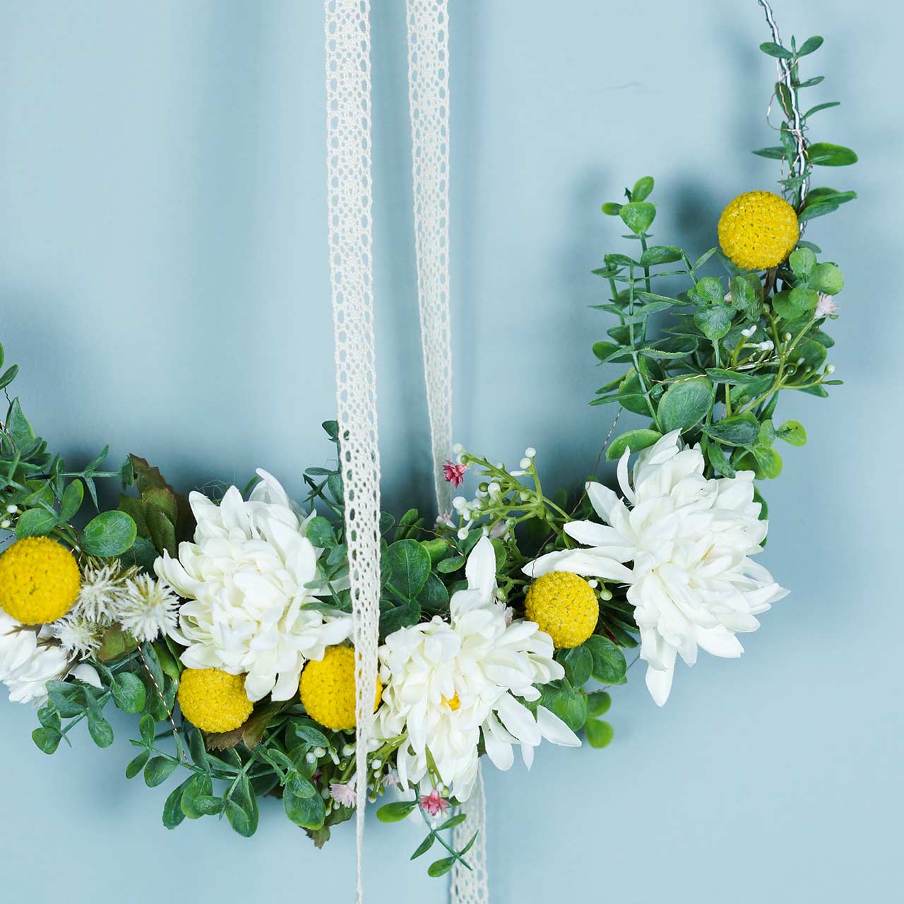 Jede künstliche Dahlie in Creme verfügt über einen Blütendurchmesser von rund 17,5 Zentimetern und ist circa 25,5 Zentimeter lang.