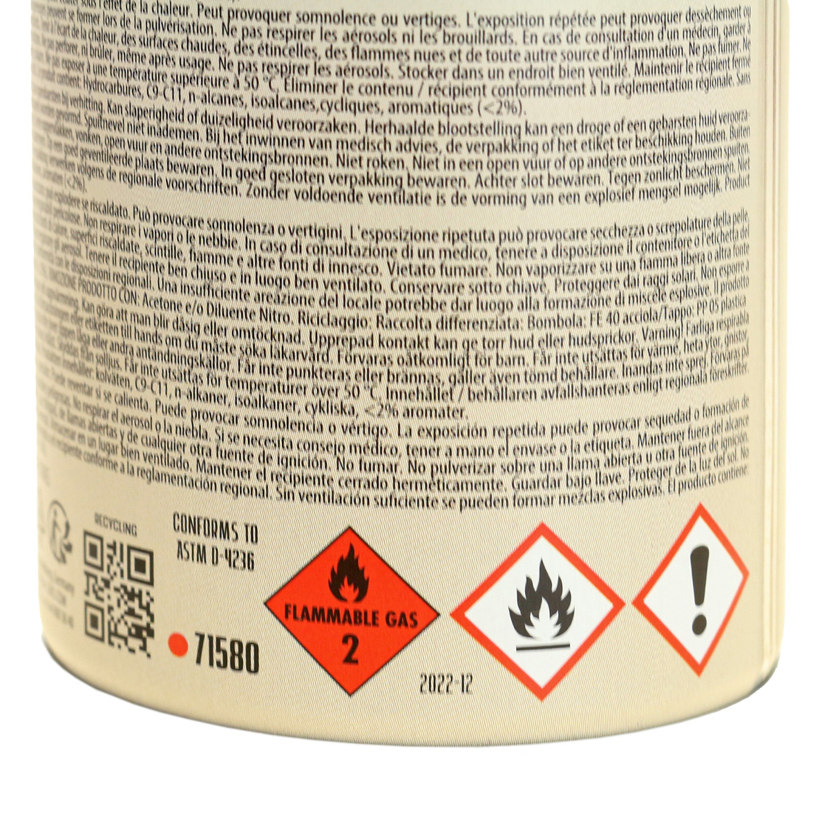 Inhaltsstoffe: Aceton, n-Butylacetat, 2-Metoxy-1-methylethylacetat, Propan, Butan, Isobutan, Ethanol, 2-Propanol, Titaniumdioxid, Xylen.