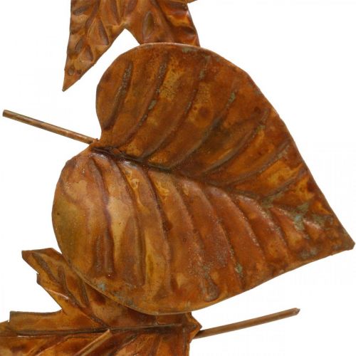 Die dekorativen Herbstblätter sind, teilweise übereinander geschachtelt, auf einem stabilen Metallring aufgebracht. Die Deko-Blätter sind realistisch mit geprägten Blattadern dargestellt und passend zu den Farben des Herbstes als Rostdeko in Orangerot und Rostbraun gestaltet.