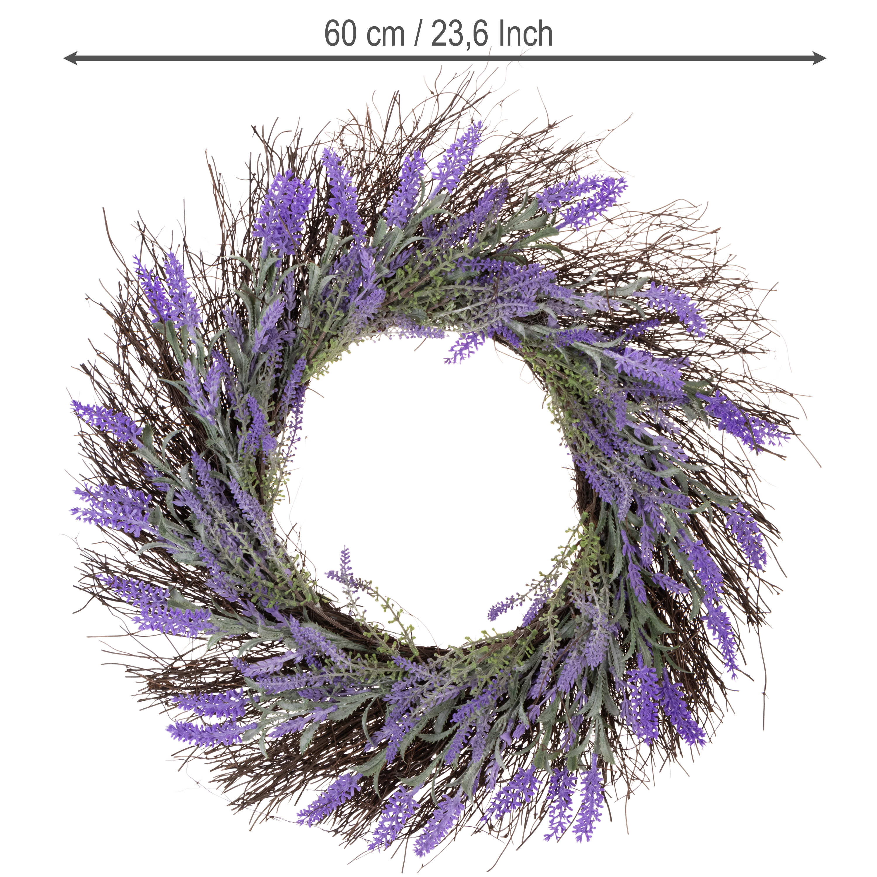 Spüren Sie schon die ersten warmen Sonnenstrahlen und möchten Ihr Zuhause passend zur Jahreszeit dekorieren? Mit diesem wunderschönen Lavendel-Kranz wird Frühling in jedem Eingangsbereich spürbar! Die liebevoll gestaltete Dekoration aus künstlichem Lavendel und echten Rebenzweigen ist ein echter Blickfang und lässt sich vielseitig einsetzen – von der Haustür bis zum Wohnzimmer. Mit einem Durchmesser von 60 Zentimetern bringt der Lavendel-Türkranz Frühlingsstimmung. Dank des stabilen Metall-Rings als Aufhänger lässt sich der Kranz einfach und sicher befestigen und eignet sich perfekt für den Innenbereich oder geschützte Außenbereiche.