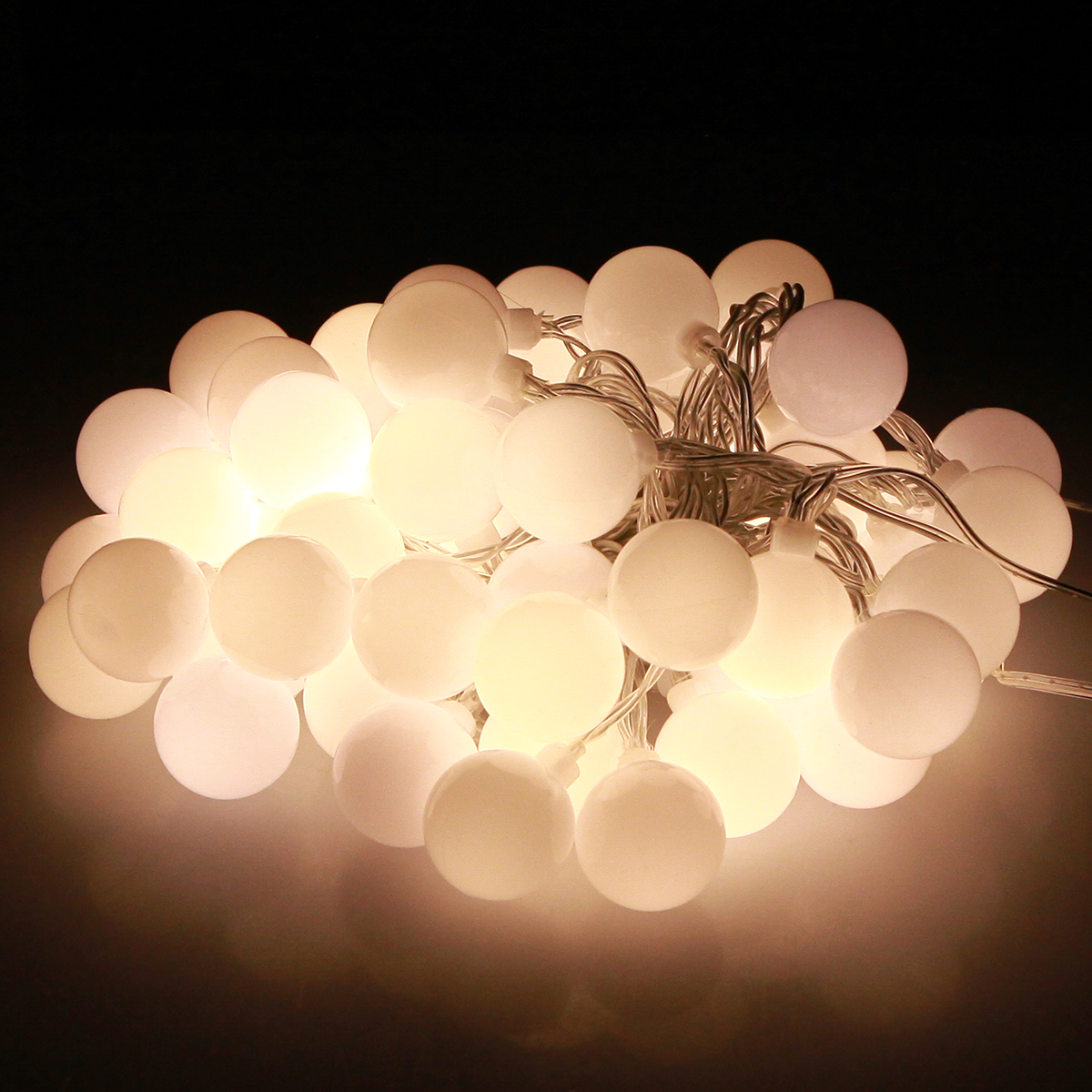 Die Lichterkette ist insgesamt 9 Meter lang, wovon 5 Meter auf die Zuleitung entfallen. Die weißen Kugeln besitzen jeweils einen Durchmesser von circa 2,8 Zentimetern, wobei der Abstand zwischen ihnen in etwa 15 Zentimeter beträgt. Die Lichterkette ist für den Innen- und Außenbereich geeignet sowie strombetrieben und wird Netzteil für die Steckdose geliefert.